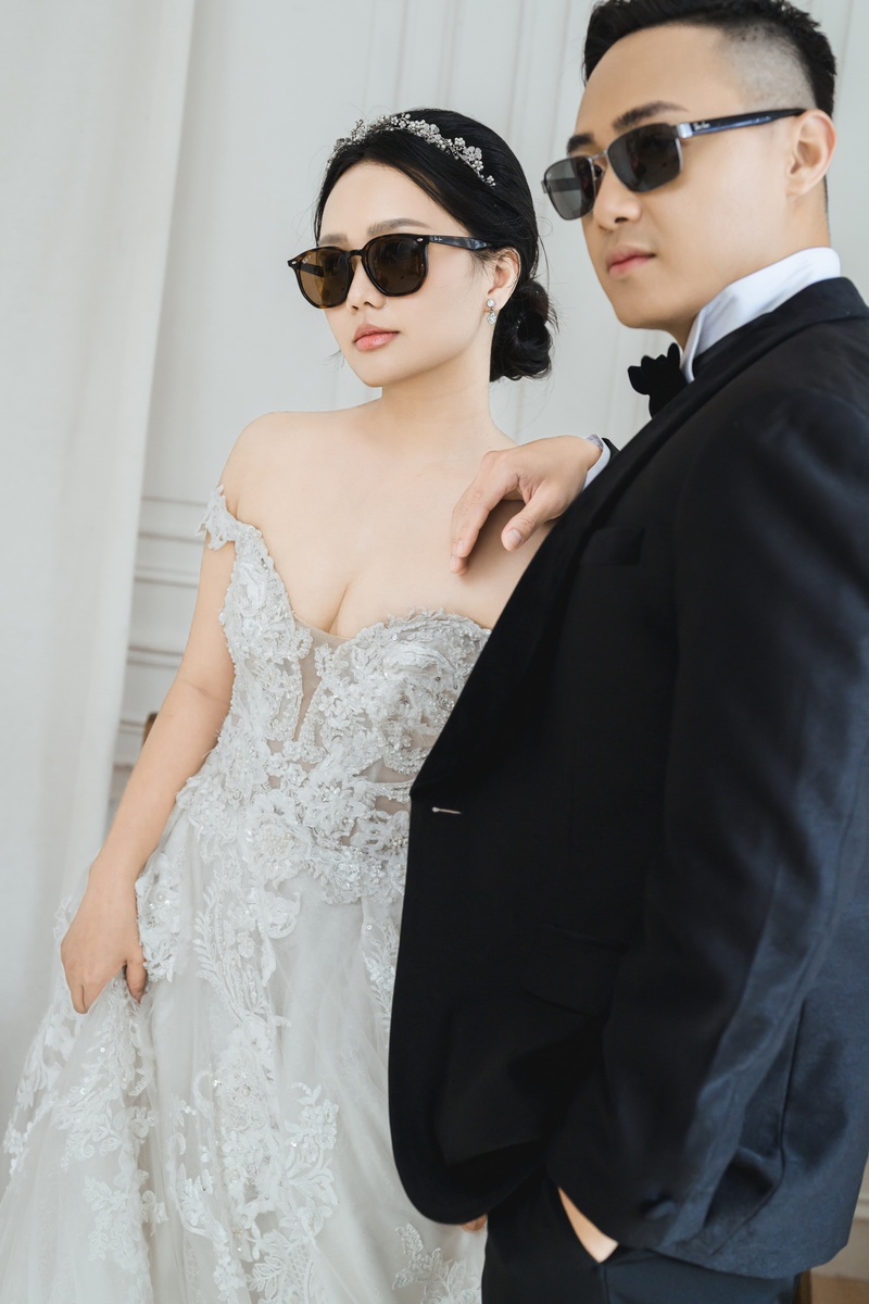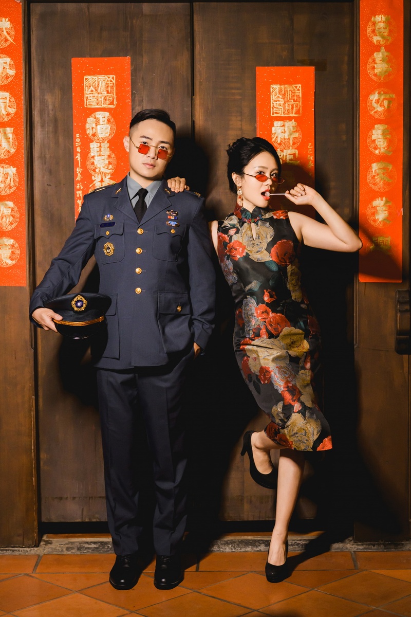 照片裡不管是穿著軍裝配旗袍、戴紅墨鏡吃棒棒糖的那種復古搞怪風,還是白紗西裝配墨鏡的時尚酷帥感,團隊都精準抓到了我們要的感覺😎