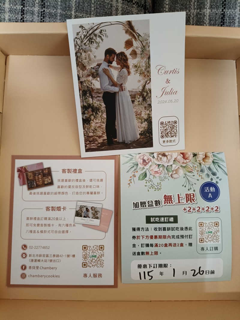 分享 麗清 推薦 1 次熱心留言 2026-01-21 在找喜餅的過程中意外發現這家申請試吃的方式也很簡單,也很快收到賴上的溝通也很清楚,過程都很舒服收到實體也比想像中的漂亮,金色很簡單俐落,紅色也很漂亮大氣裡面的蝴蝶酥不會很甜,也不膩很推薦 推薦商家 香貝里 Chambery 喜餅 評價 (13) 禮盒(5) 方案(7) 詢問 覺得 讚爆了超推 喜餅 CHAMBERY香貝里手工餅乾 0 1 個讚 0 1 則留言 000 357 次瀏覽 讚 留言 收藏 分享 分享 分享至 LINE 分享至 Facebook 複製連結