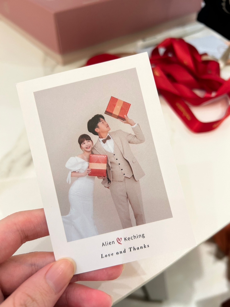 除了餅乾本身很好吃之外,禮盒設計也很好看,各有特色,但比較偏好高訂系列,雖然餅乾數量不多,但盒子很大器,另外紅色提袋喜慶又好看,當天訂購達一定數量也不會加價。此外也可以印製新人的照片,只是只有公版,有點小可惜。