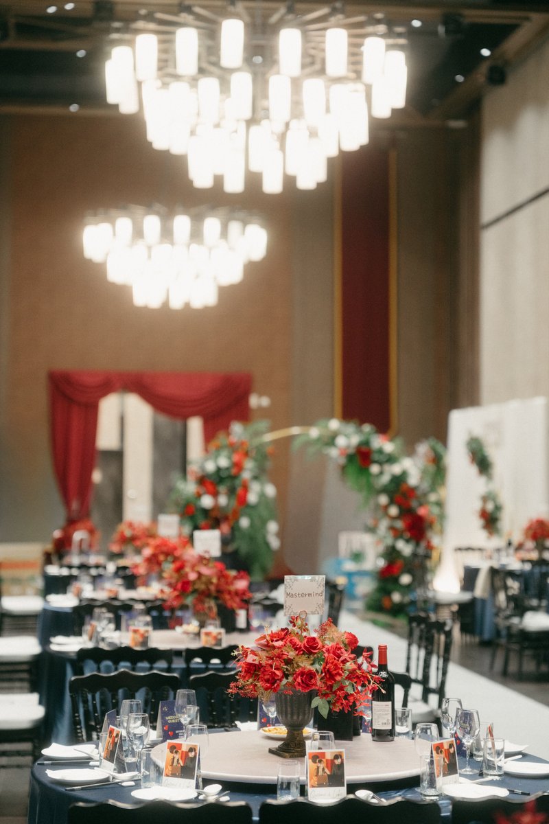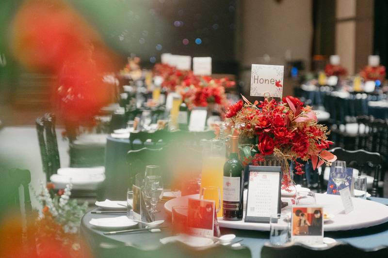 一進到八德彭園,最吸引人的就是挑高的大廳,空間感完全沒有壓迫感,讓人覺得非常舒服且大氣,賓客一進門的印象分數就很高!此外,桌花的佈置也非常漂亮,看得出館方的用心,讓整場宴會的質感提升了不少。