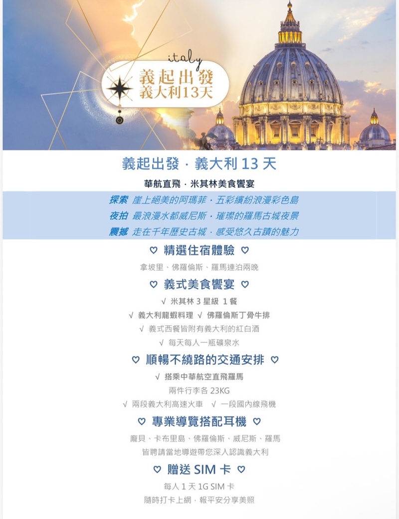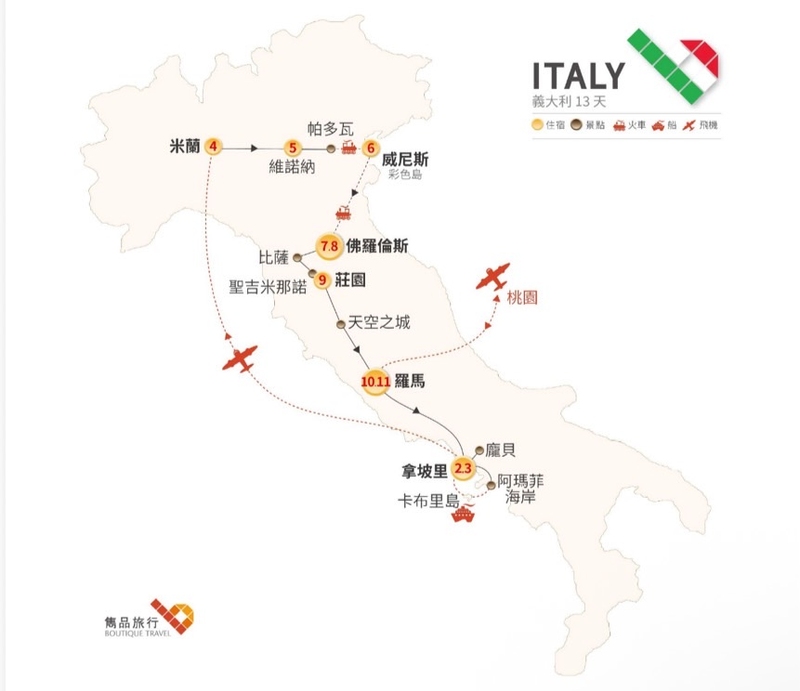 上網查了很多資料,我們最後選擇了雋品旅行社的[義起出發 義大利13天]的行程,很適合假期天數不多的人。