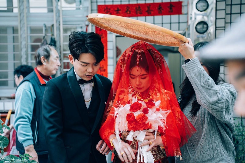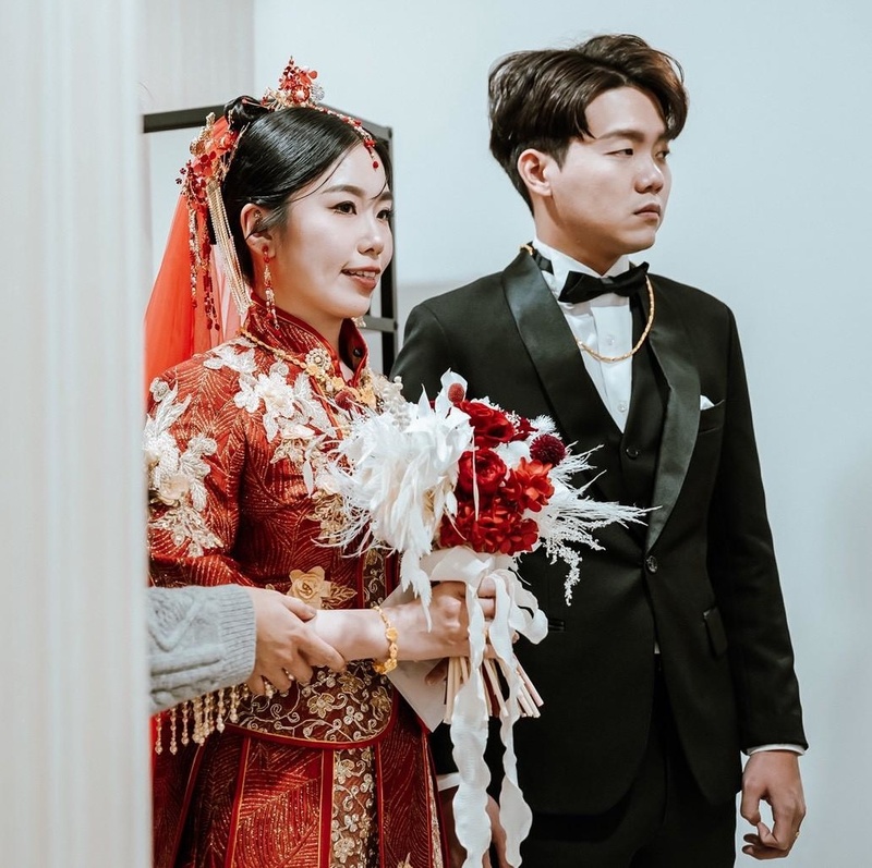 第一套迎娶的禮服是中式復古感紅色系的宮廷風格,