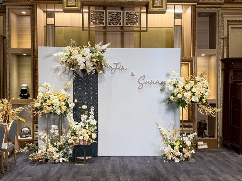 花藝的部分是選用仿生花去製作,整體是走淡色系較柔和的感覺,很典雅