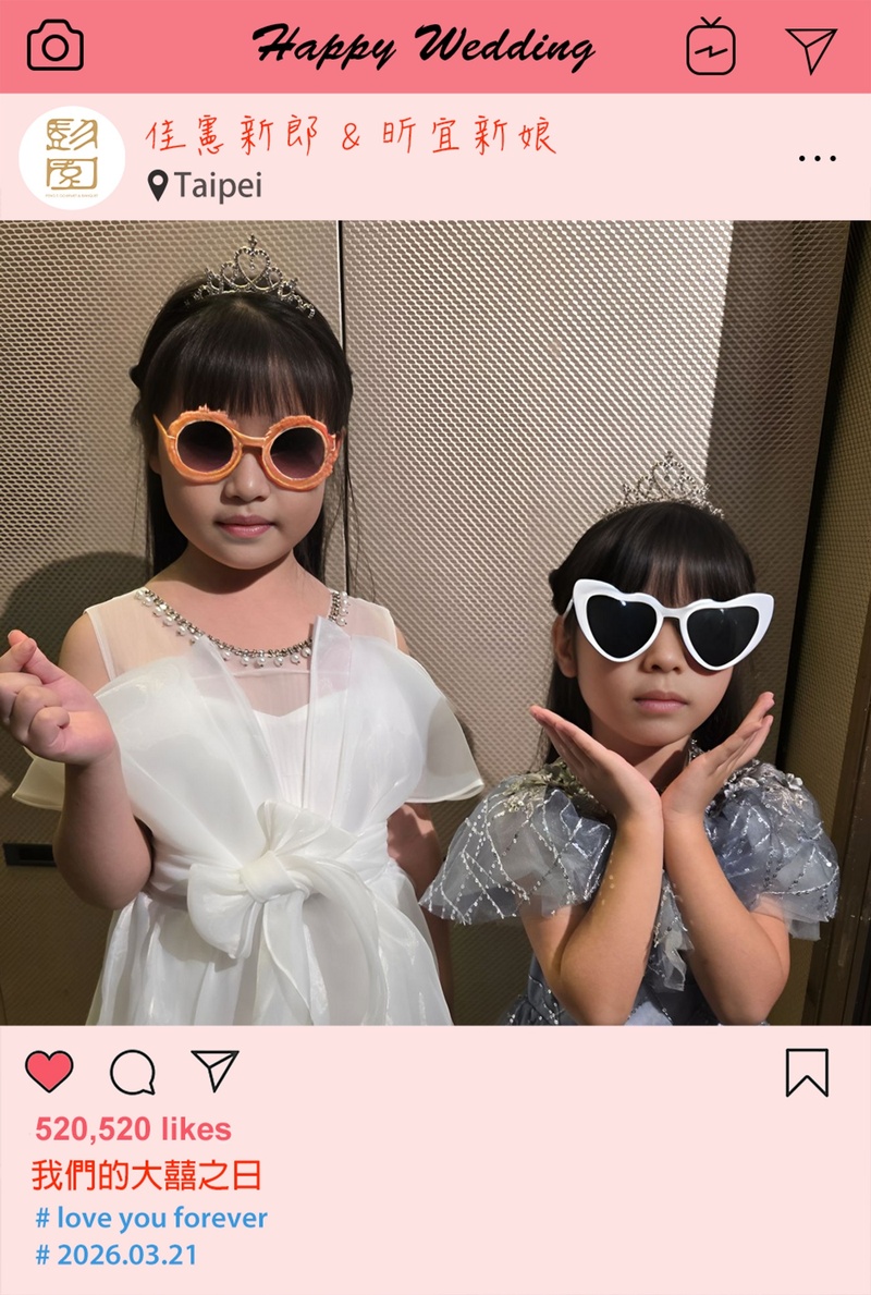 最喜歡的是可以即時印出照片,而且版型有我們的婚禮資訊,大家都會帶回去收藏,變成很有紀念價值的小禮物。像花童戴墨鏡那幾張真的超可愛,也變成大家當天討論的亮點之一。