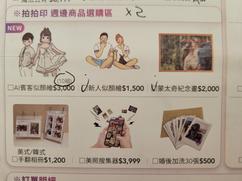 除了實體婚紗照、實體婚禮紀錄外,還有似顏繪電子檔跟蒙太奇(婚紗照拼貼),亦可換成其它成品。(包含在方案裡,非加購)