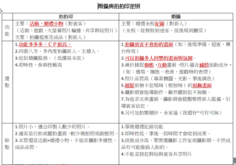 當初我們先下訂了拍拍印,想把工作人員跟賓客當作免費婚攝就好。後來我很認真做了功課,比較拍拍印跟婚攝的差別。結論:本質還是有差,專業領域不同,所以我們沒有因為拍拍印就捨棄了婚攝。差別請見下方: