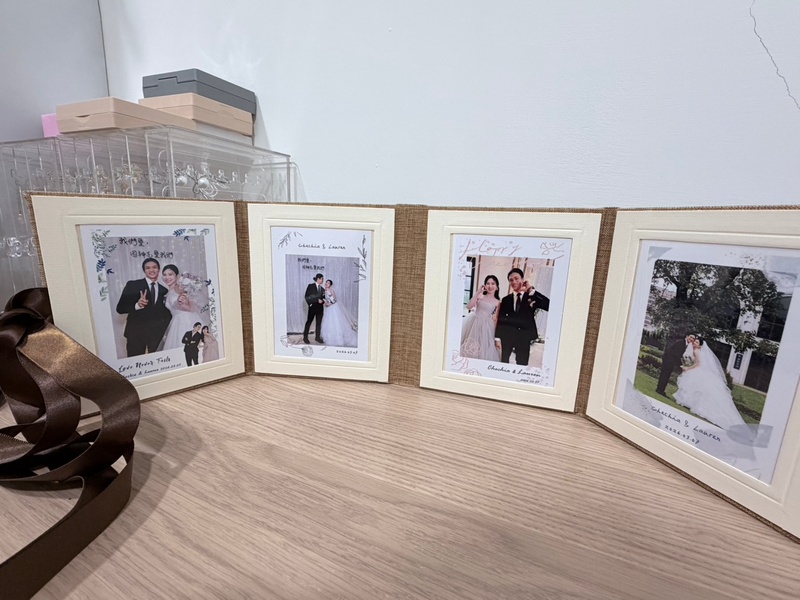 最重要的邊框設計的部分也想要大推拍拍印的設計團隊!拍拍印的後台提供了應該有超過百種不同的邊框,可以由新人自己挑選喜歡的邊框和文字,字型字樣都可以做調整,真的是不怕挑不到喜歡的,只怕可以選擇的數量太少。在第一版邊框選擇完畢後,設計師會加入群組內與新人溝通設計,在溝通的過程中可以感受到設計師的用心和考量!我們選擇的邊框是比較淡雅的(留白較多),所以在文字的大小和配圖的比例上會需要做調整~在和設計師提出後,設計師馬上注意到這個細節並給了我們很完美、即時的優化版本。最後設計出來的五款邊框完全就是我們喜歡的,也符合我們整體婚禮風格的~
