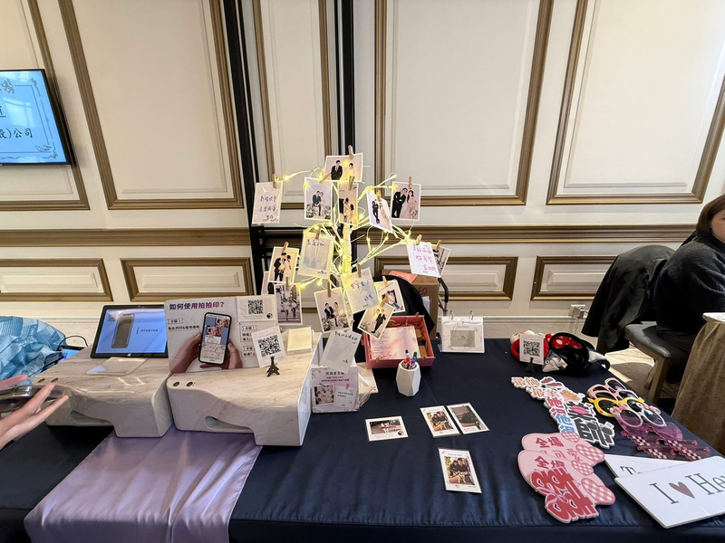 決定了要用拍貼服務後,和隊友一起做了功課,因為我們宴客的桌數多(>30)又是午宴,所以比較不考量拍貼亭,擔心賓客會因為排隊過久而減少使用的次數,因此最符合我們的需求的就是手機拍貼了!在對比了數家的服務後,我們最後選擇使用拍拍印的服務~賓客不需下載 App, 使用 LINE 掃碼即可加入,所以在場的長輩與不同年齡層基本上都可以快速入手並開始使用~這點真的是大加分 ❤️