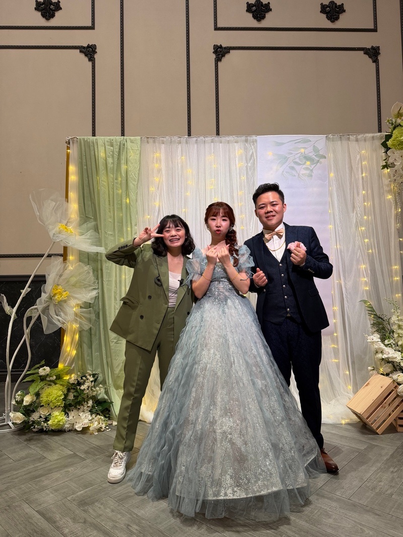 婚禮當天,婚禮小管家「Irene」 簡直是我的貼身守護神!隨時幫我拉裙襬、對位、提醒進場節奏,甚至連我的飲水跟心情都照顧到了。還有婚禮音控「坤霖」,音樂與燈光的切換精準無比,完美營造出溫馨又歡樂的氛圍,讓每個環節都充滿電影感。