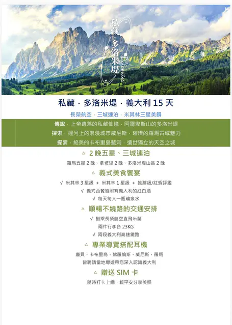 #揪團 雋品旅行 26/5/23出發_私藏_多洛米堤_義大利15天