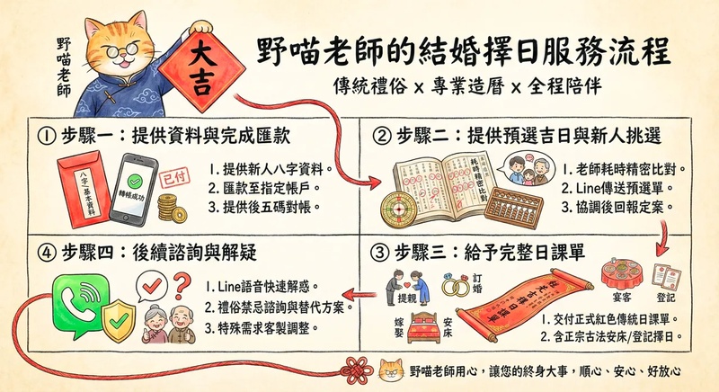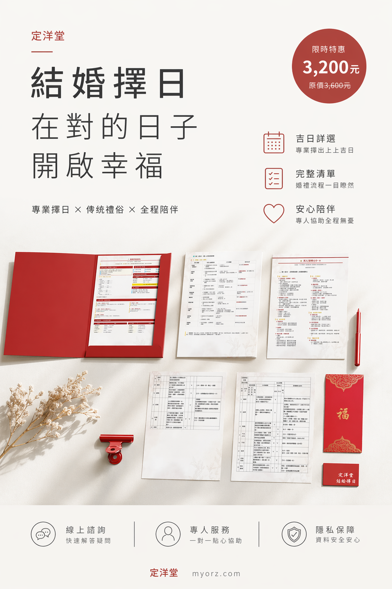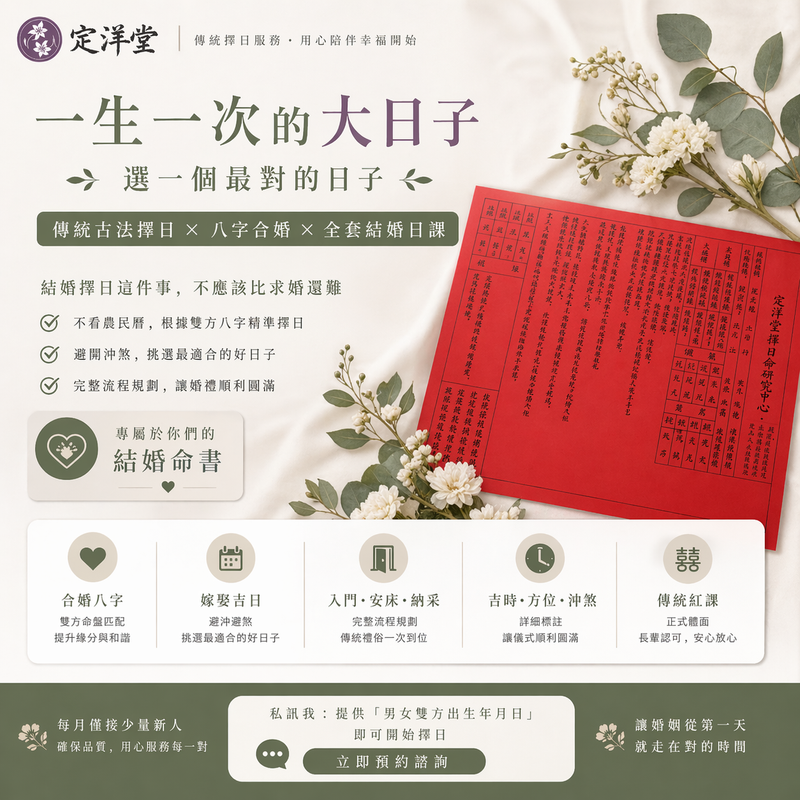 老師會依八字避開雷點,還附贈婚顧級的流程 SOP 懶人包,對於想省事又怕被長輩唸的新人來說,這份「擋箭牌」真的必備。與其自己翻農民曆越看越亂,找專業的一次解決最快。