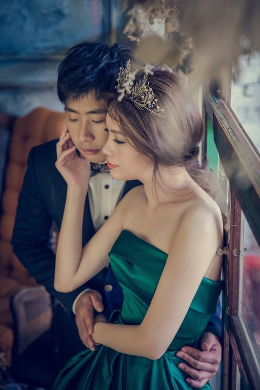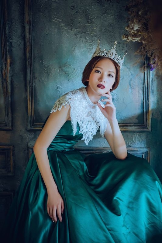 這張是同一件綠段面禮服,因為加了新秘老師_Joyce的超強大飾品,很多人以為我穿很多件禮服。這個是壞皇后,與上一張的光線不同、妝容不同,看起來氛圍也不同,這樣也是能讓我快速進入狀況的原因。ps:那麽慢才介紹到新秘Joyce老師是因為想先讓大家看她可以變出多種造型,飾品又超強大、服務超細心,真的是很厲害的新秘老師!