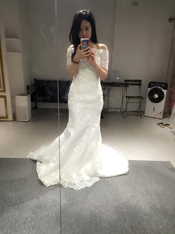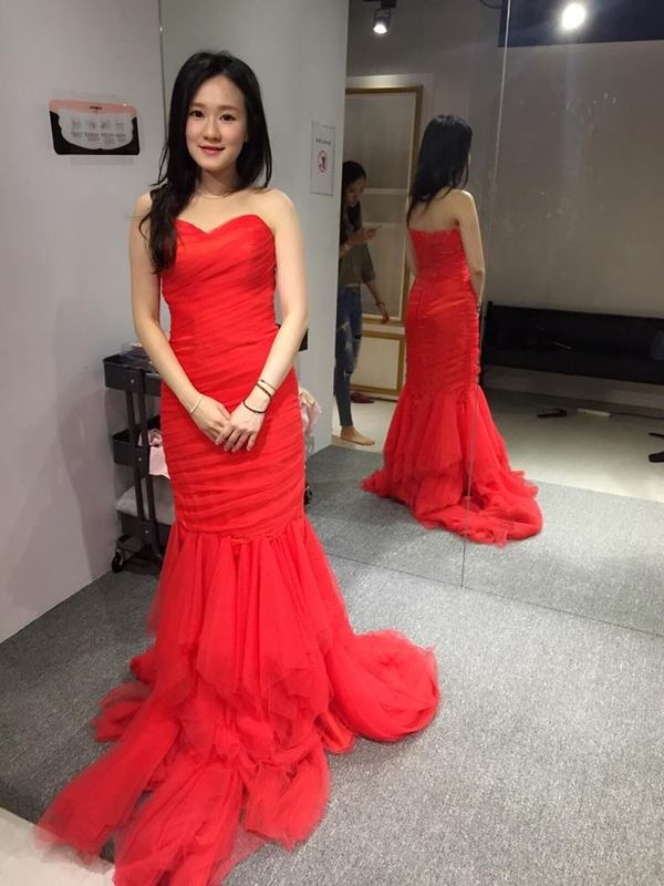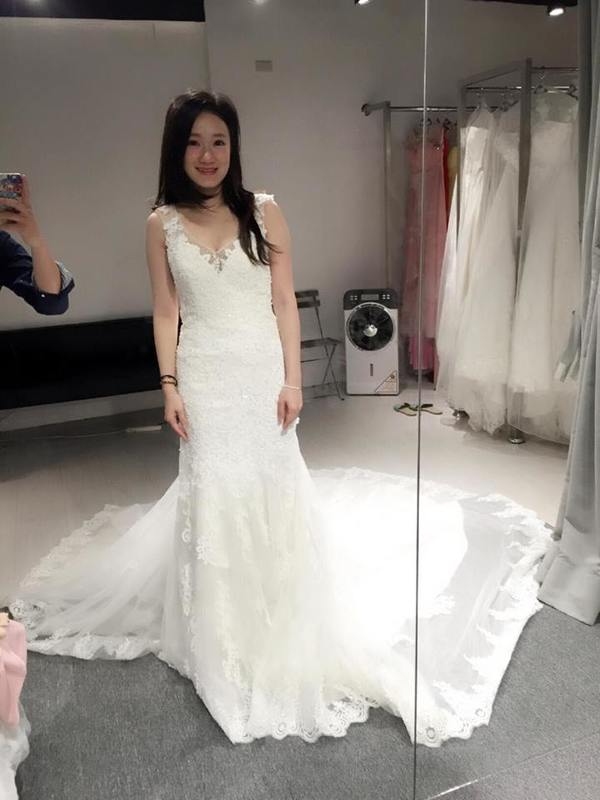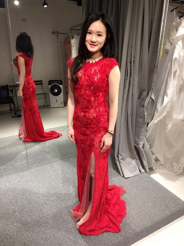老實說~ 本人一直以為自己不適合紅色系 ~ 但這天試了三套紅色 都覺得還蠻喜歡的 合身 又加上我個小還挺適合魚尾款式系列的 原本以為我屁股比較有肉 怕魚尾會太寬!! 沒想到還修飾了我的身材 所以我選的白色 紅色 綠色 都有試到魚尾的~ 這款帶點中國風貼身開衩的裸紗更是讓我個小女生也可以變性感唷!!