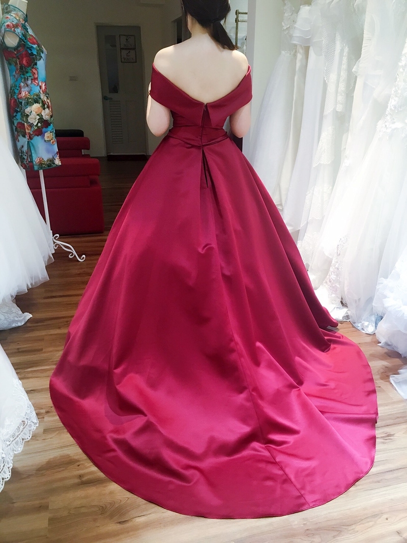 禮服一: 很有氣質的緞面款,紅色高雅又大方,重點是可以遮肚又遮手背的,完全就是孕婦的首選