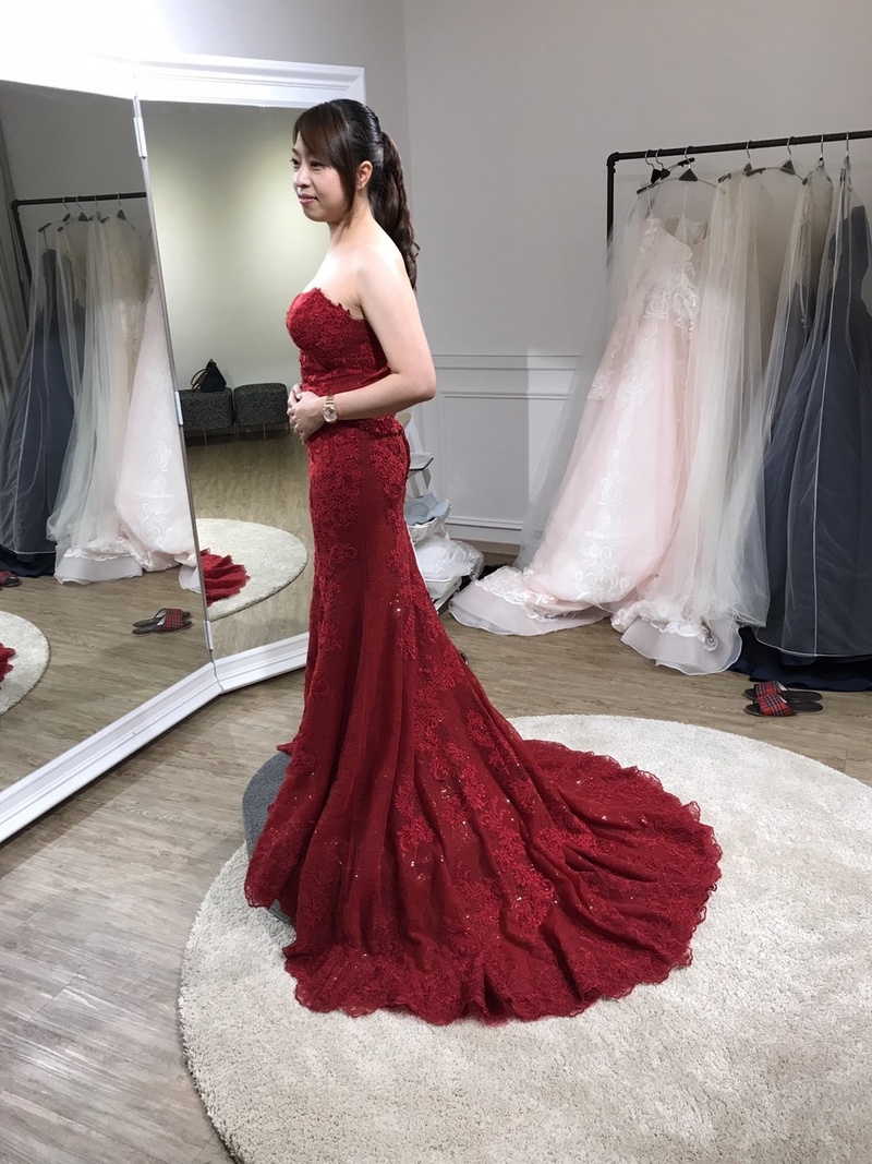但這次試了2件魚尾款,完全顛覆我的觀感,第一套是我要求要的紅色禮服,拋開既定的觀念硬著頭皮穿進去,天啊!超完美!沒想到矮小的我也有瘦高的一天啊XD