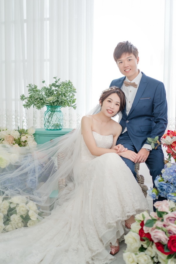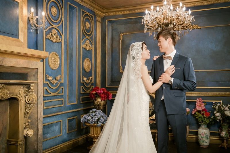同樣在棚內,戴上莊寧特地準備的美麗滾邊刺繡頭紗,轉場置身歐式壁爐及水晶吊燈的古典華麗,則滿足了老公對宮廷風的想望。