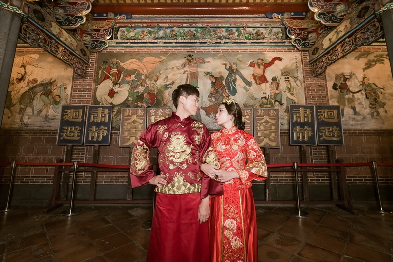 最後的拍攝場景是因為兩光的我壓根沒注意到拍攝當天是週一,林安泰古厝休館,而臨時由Ken推薦的保安宮。保安宮是從小定期去拜拜的地方,但一直以來只見過白天的保安宮,沒想到,夜晚的保安宮如此美麗,自備的秀禾服在昏黃燈光與祈願燭光的光影交織下,更顯刺繡的細膩及中國風的古典,而如此特別卻短暫的光影色調,幸好有Ken和河馬幫我們永久保留。