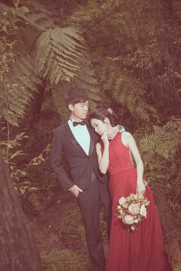 黑森林是因應當天擎天崗煙霧迷濛與Ken討論後臨時決定前往的場景,卻恰恰極其適合,彰顯紅與深綠的強烈對比,更嘗試了不同於以往婚紗照甜笑的空靈縹緲(空洞?XD)。Ken的專業引導、河馬的氣氛營造及莊寧適度強調眼尾的彩妝,都幫助我不至於呈現眼神放空呆滯貌(雖然11、12度的濕冷天氣已凍到近乎身體和腦都當機)。