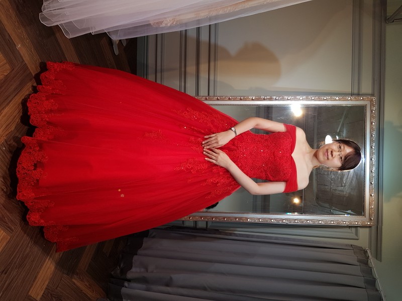 最後選到了卡肩彭裙的紅色訂婚禮服,有讓我在乎小腹明顯問題消失,又因我取消西班牙禮服特別的提供另一套送客禮服,我的禮服風格的做個亮眼的公主,送客也有件淺藍帶亮麗型禮服!