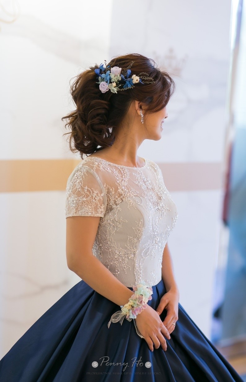 二進~使用了藍色系不凋花,因舞蹈入場,採用高馬尾造型,呈現簡約中帶點俏皮,一樣強調線條感。
