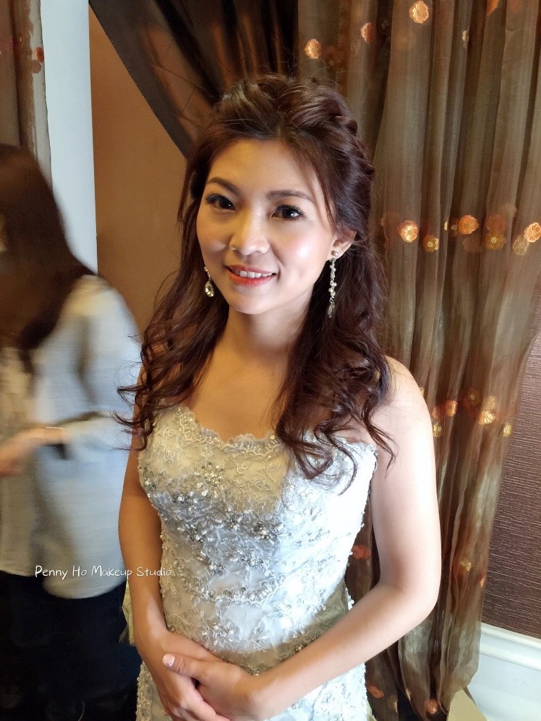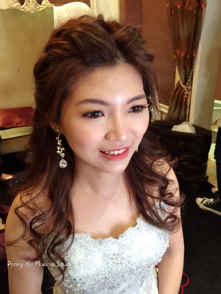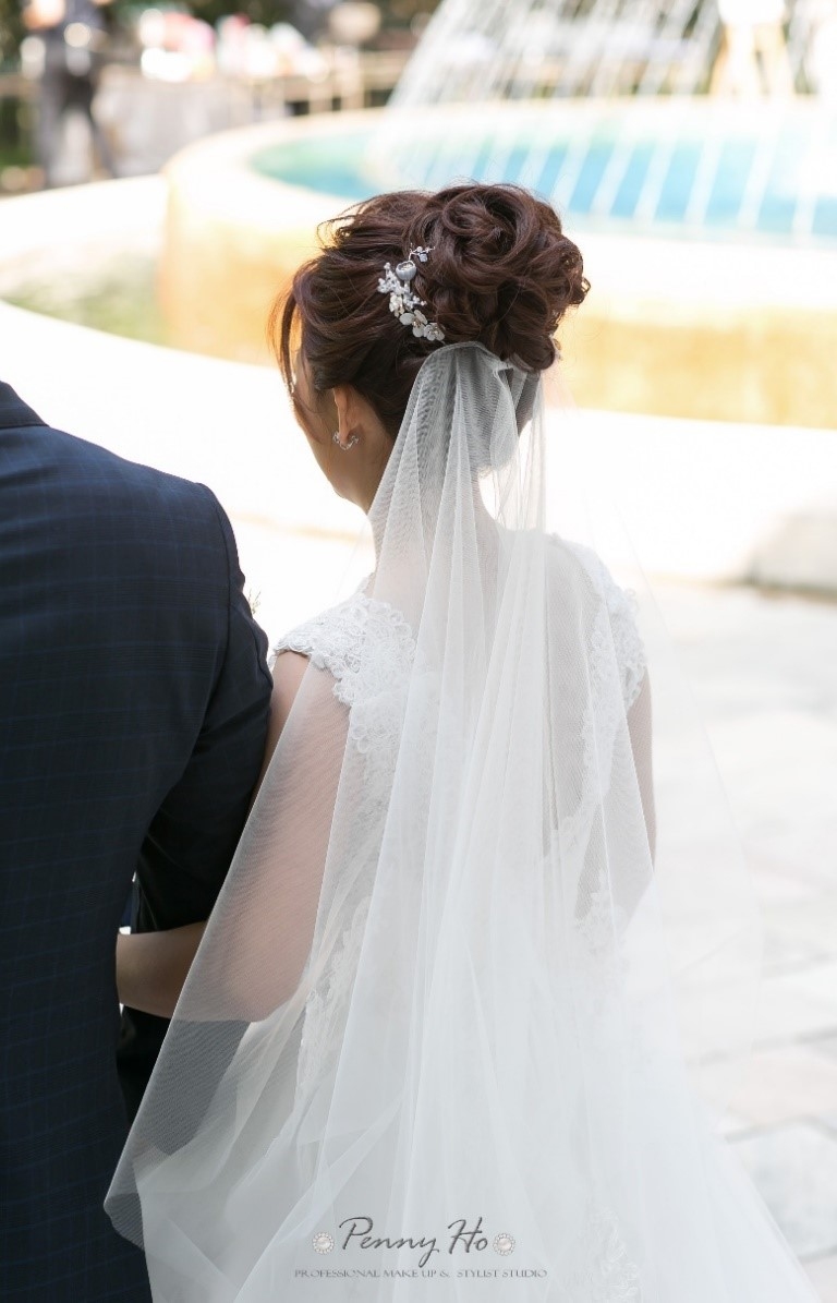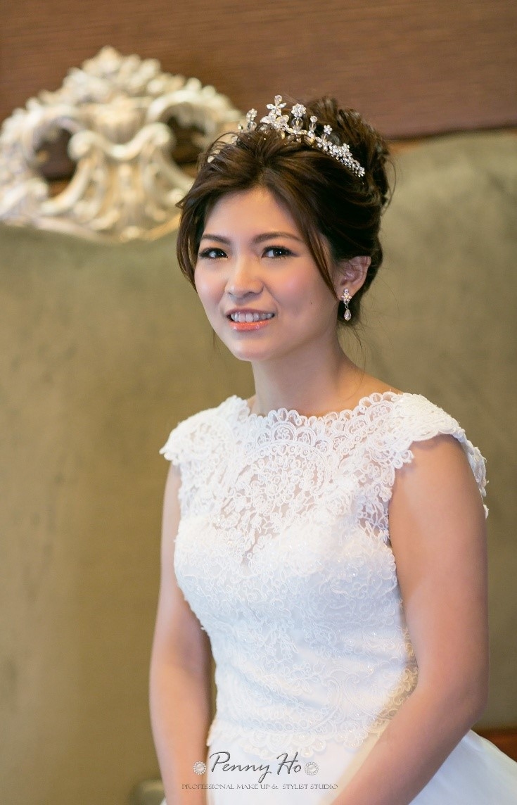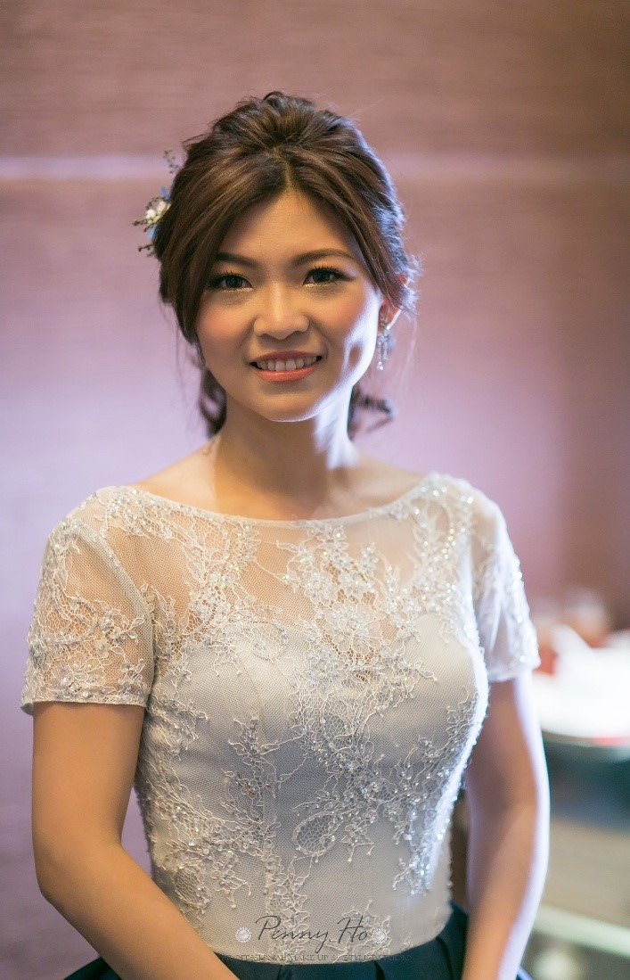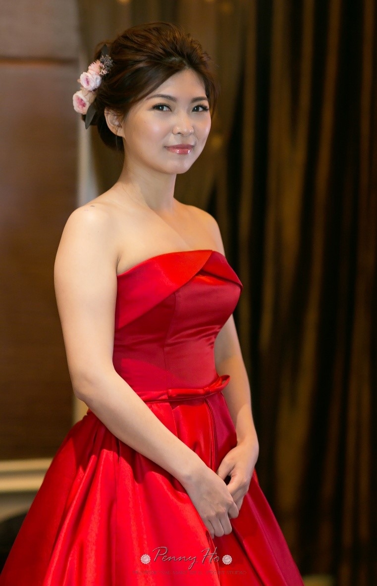 婚宴當日,早起05:30開妝,完妝約3小時,過程中我的眼皮呈現水腫到慢慢張開,PENNY非常有耐心的一直幫我調整眼晴,一絲都不馬虎,到宴會場地凝視一翻滿意後,文定儀式就開始了,在儀式過程中與後續的證婚議式、一進、二進、送客,PENNY姐都會在旁跟妝,試時調整我的臉妝、造型,每個造型都有所變化,讓人驚豔,如此心細的PENNY姐,讓人好感動,所以當天我非常放心的把自己交給她。