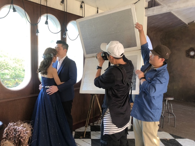 化妝後,我們就開始在陽光攝影棚拍攝。一開始的我們是超緊張的,無論動作和笑容都很生硬。君川好細心地教導我們每一個動作,又用一些輕鬆的話題,令我們放下緊張,越拍越順利。君川總讓我們有一種能量,讓我們會好放心把自己都交給他。再有燈光師阿謙勤勞的幫我們打燈,又放裙擺,又會舒緩緊張氣氛,真的好棒喔!之後,我們就去了淡水大屯莊園拍,當中我再一次感受到君川的專業,他為我們安排了適合的場景,又設計了一些動作給我們。對於君川的攝影技術,我絕對相信,但我沒想過,專業到連我老公都跟我說「老婆,我相信君川比你自己更清楚知道你想要什麼😂😂」對,君川就是棒到這個程度~
