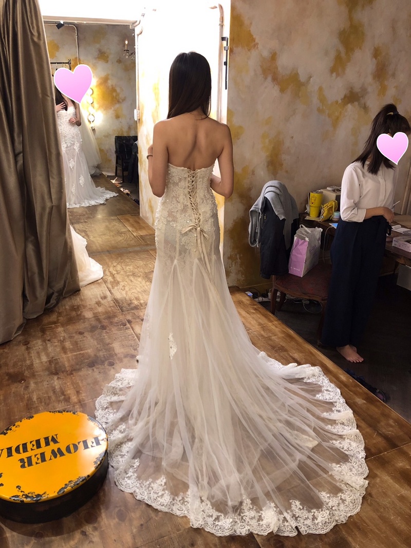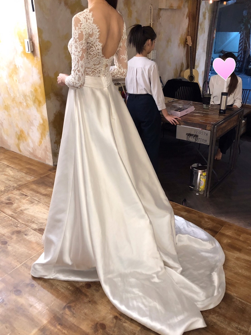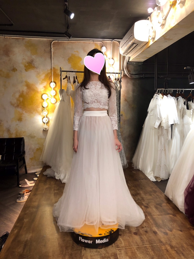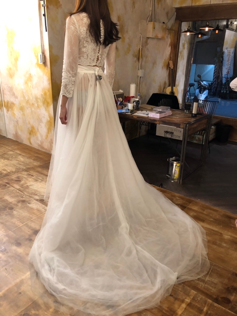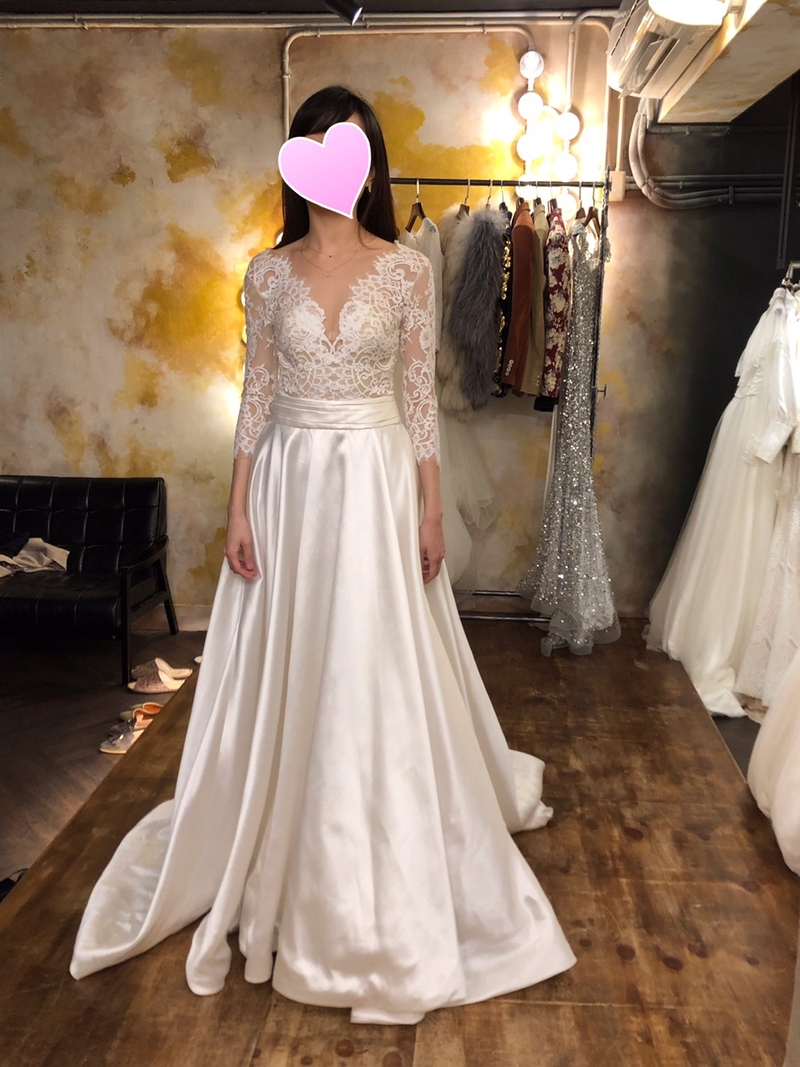 這件是異材質拼接 上身是貼身的蕾絲 下半身則是緞面的大裙襬