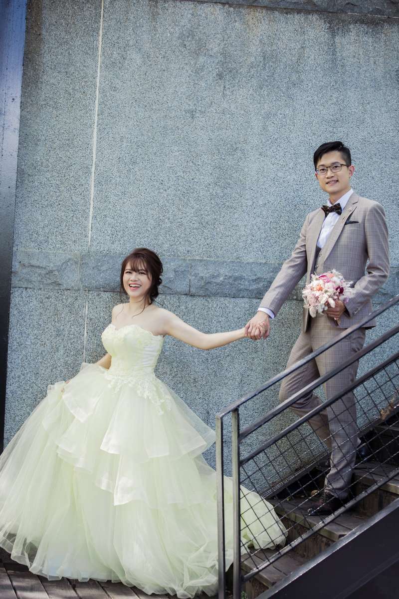 婚紗拍攝前也跟攝影師阿信溝通,表達我們眼睛嚴重畏光,只要有一點陽光一定是皺著眉頭,眼睛瞇成一條線的困擾。阿信帶我們去陽明山和淡水附近的海邊,找到合適的拍攝地點,替我們找樹蔭、還有算準雲會過來擋住太陽的空檔,抓準時間拍照。阿信及助手都很有經驗而且幽默風趣,一路上一直和我們閒聊,拉近彼此的關係,拍照時也很耐心地幫我們喬拍照的角度,看到成品時真的非常喜歡!妝髮的上綺老師功力也真的十分厲害,都沒想過新娘子可以變得這麼漂亮,十分推薦!