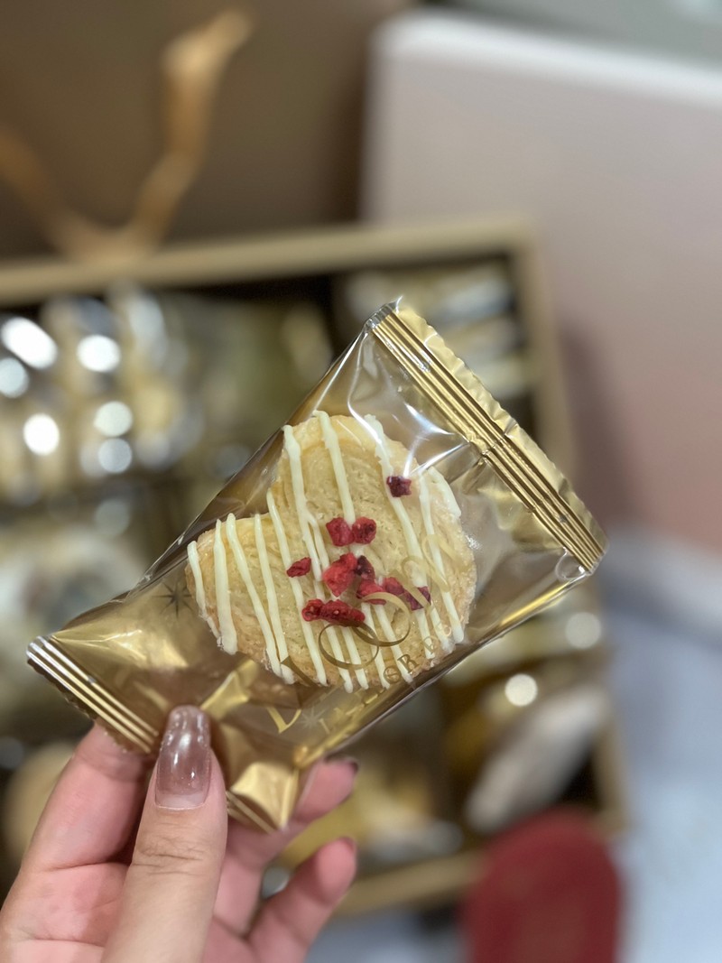 盒內的餅乾種類豐富,有法式草莓、水蜜桃花圈馬林糖、洛神玫瑰達克瓦茲、磅蛋糕等,每一款都像精品一樣用心製作,連甜點控的朋友都說驚艷。口味上吃起來是法式的細膩香氣,吃起來不會太甜膩卻很有記憶點。