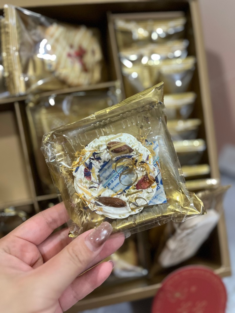 收到試吃的喜餅禮盒真的太美了!從裡到外都充滿精緻與質感。金色包裝高雅大方,每一塊點心都獨立包裝,乾淨又方便,完全展現出品牌對細節的講究。