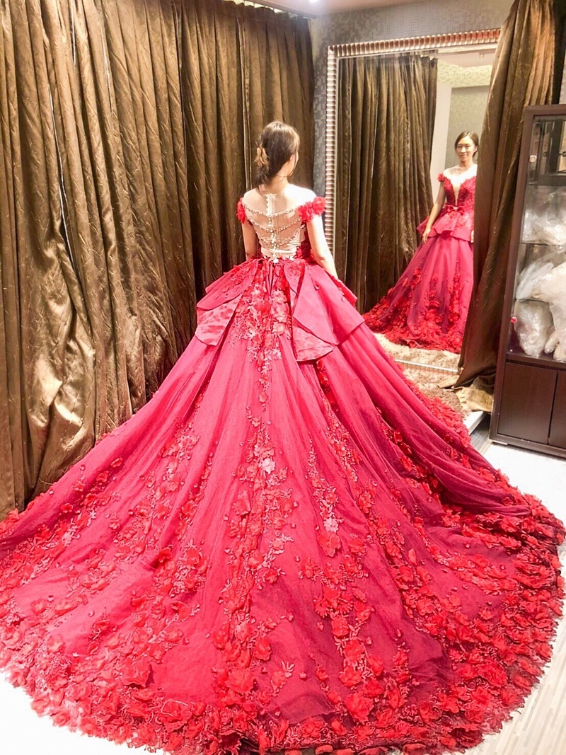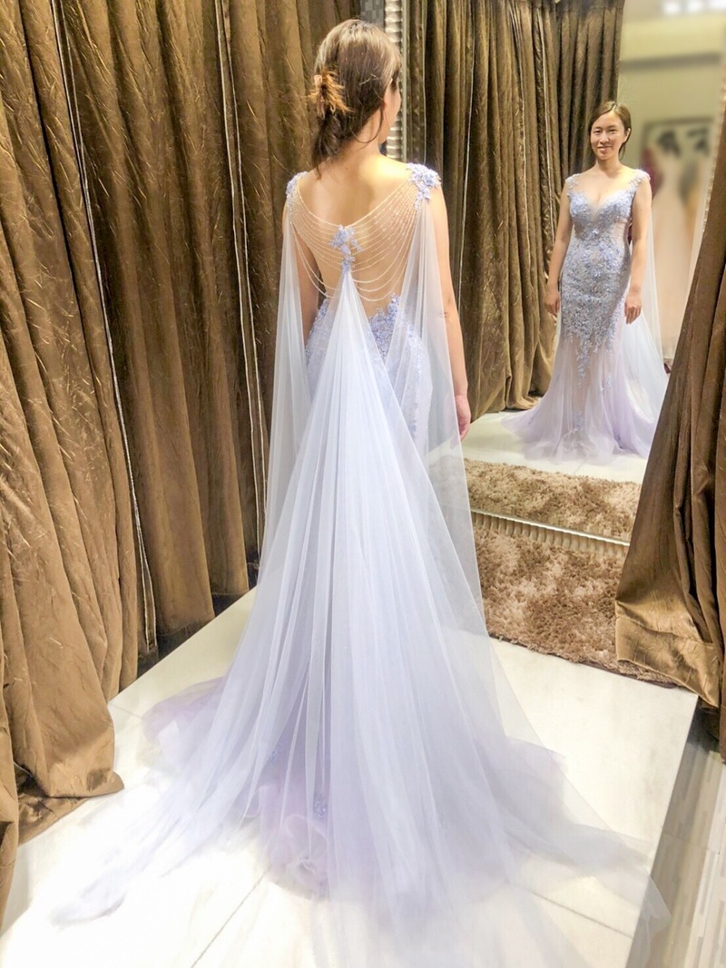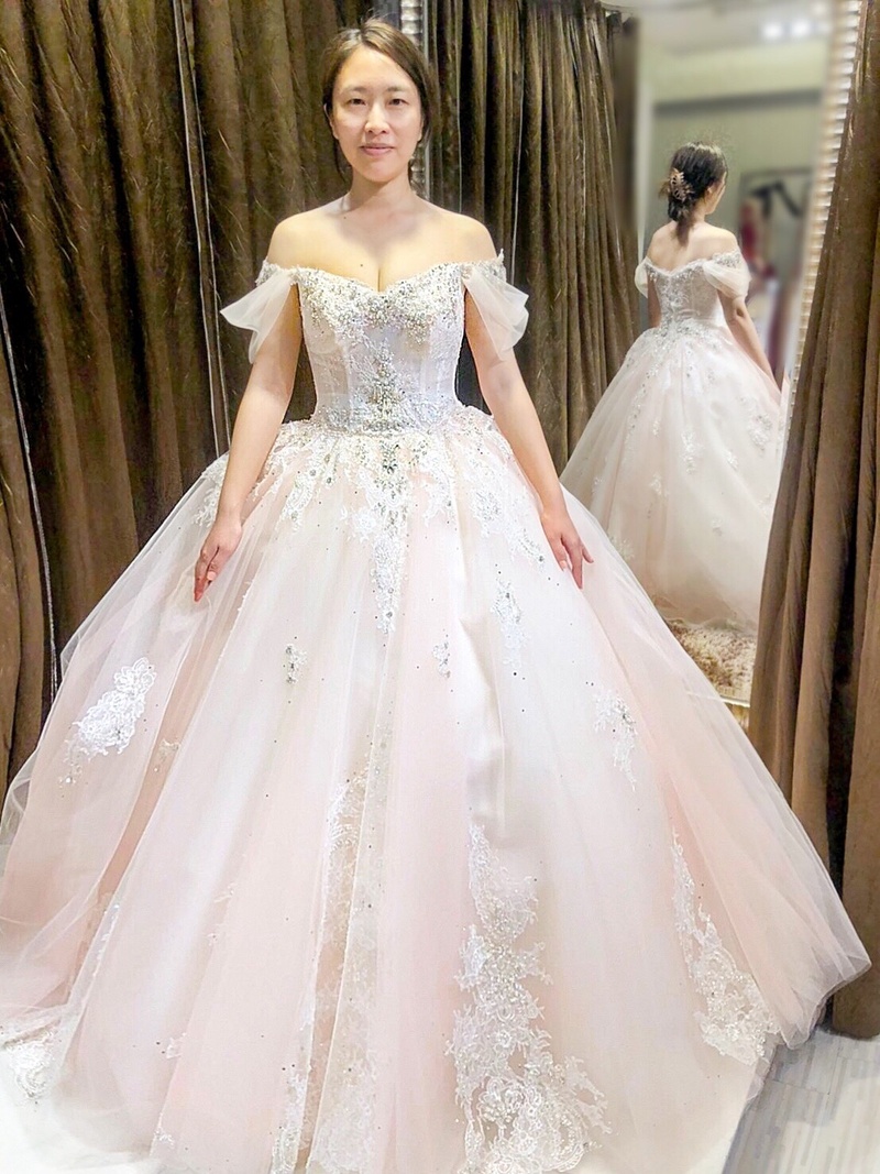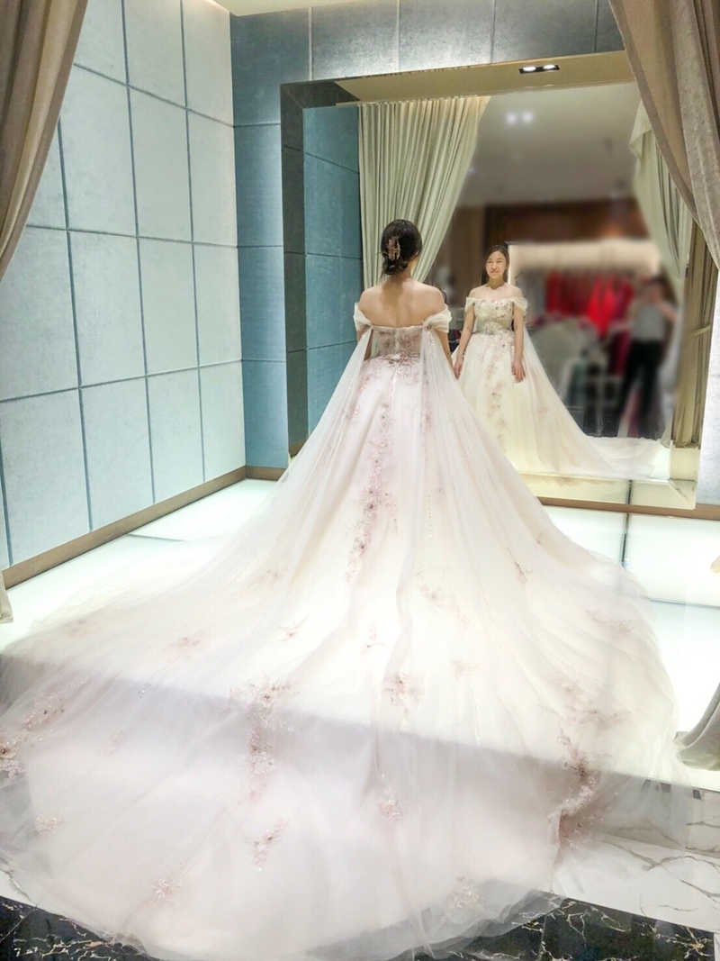 禮服秘書跟助理互相配合,細心地為我套上各種婚紗禮服,不論是加蓬裙或窄版,她們都會小心、溫柔地為我們試穿,她們的專業,展現在各種婚紗禮服的穿脫上,對於各種複雜的婚紗禮服穿脫,她們都瞭若指掌專業,我配合她們專業的指令,順利試穿了各種婚紗禮服,流程相當順暢。