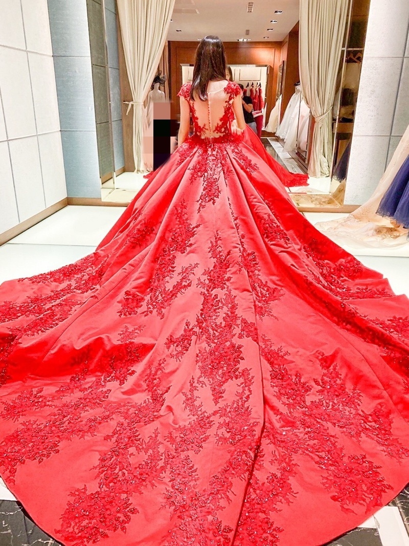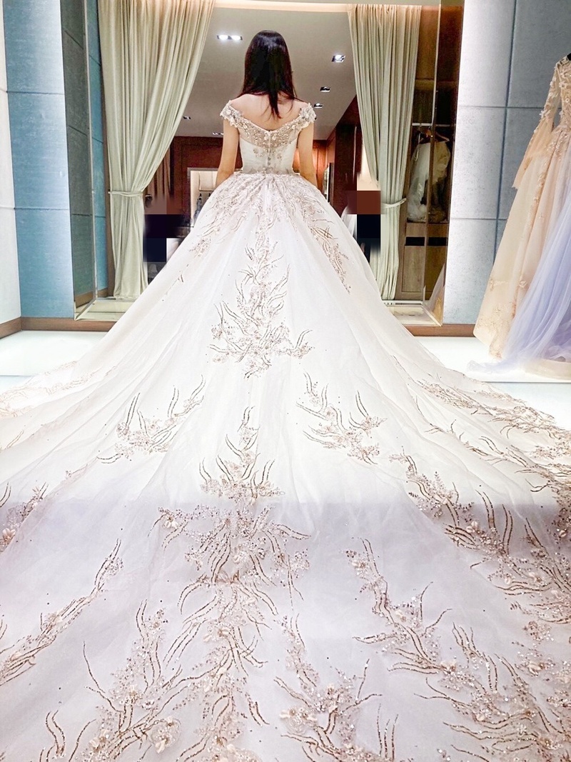 第四套是韓式魚尾白紗禮服,上面還有很多手工蕾絲設計,是很有氣質的款式,後面的裙擺也很美呢!