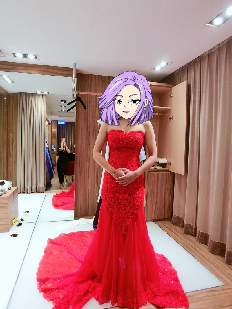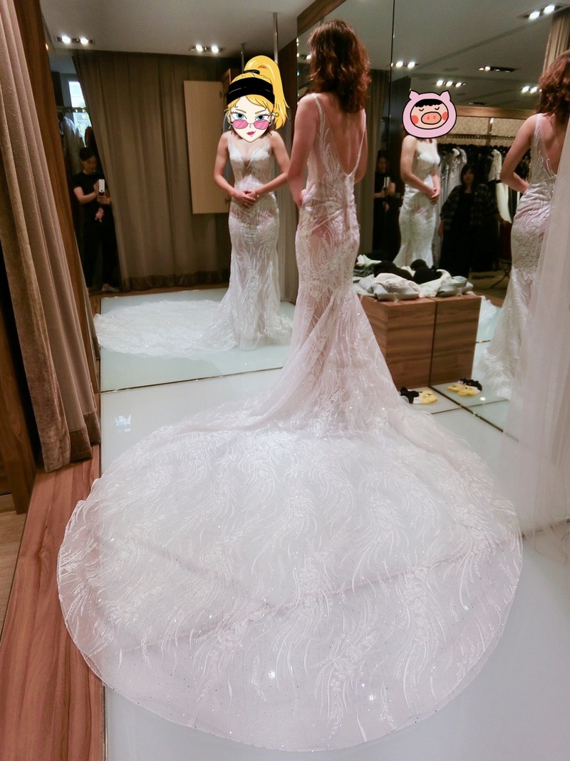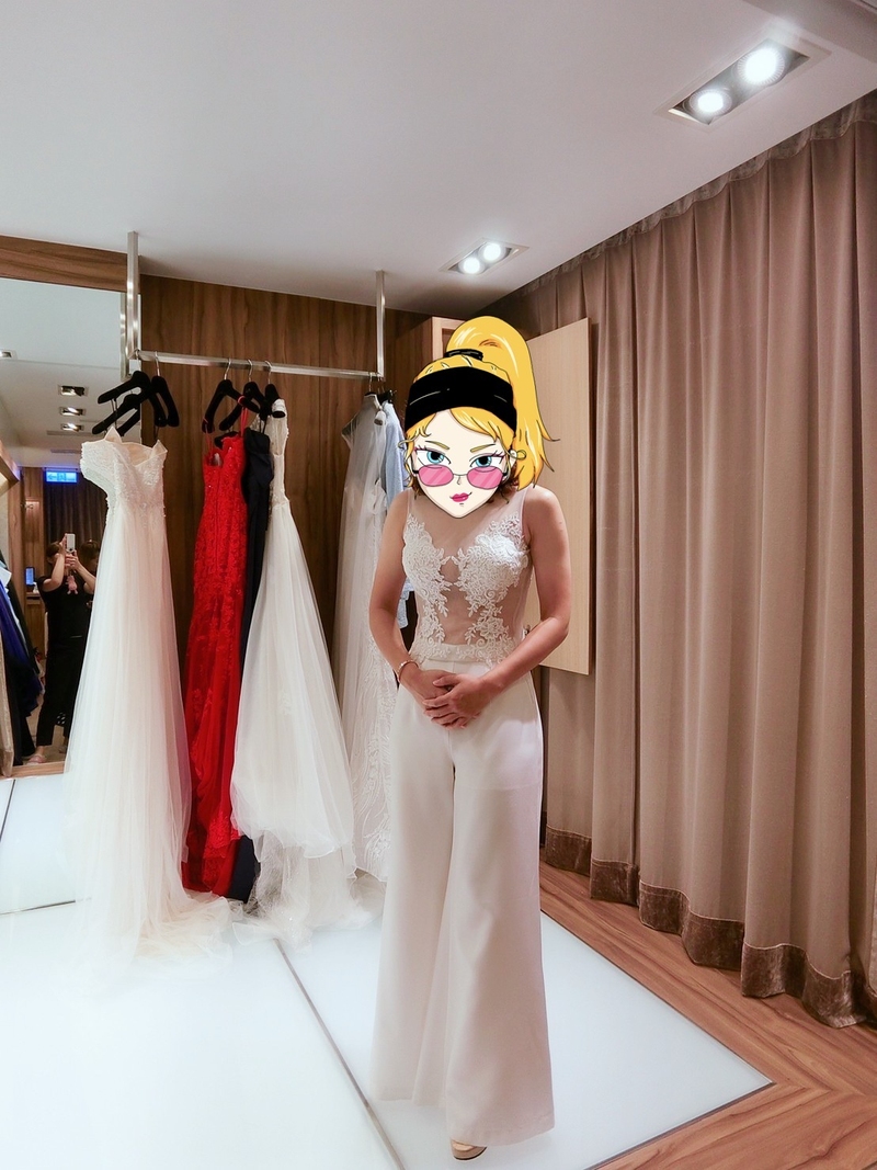 時間來到了挑選拍照禮服時刻,我並沒有太多想法,就相信他們會幫我找出最適合的,昆娜幫我安排的禮服顧問ARLIN讓整個挑選過程一直呈現非常嗨(我本身也很嗨),完全無距離感,一見面他就說我跟他某個客人很像啪啪啪的就聊了起來,差點把昆娜屋頂掀了!!哈哈!!談話過程中就簡單詢問我想要的風格及喜歡的類型,第一件就送上猛地給我!裸紗!我遲疑一下就是穿起來了整個也愛上哈哈哈哈哈,隨後幫我準備幾件衣服都蠻適合我的,邊試穿邊講解可如何搭配.....等,當天該注意什麼事項,整個非常專業,也不私藏衣服,挑好挑滿,我現在已開始期待我美美的婚紗照了~!!