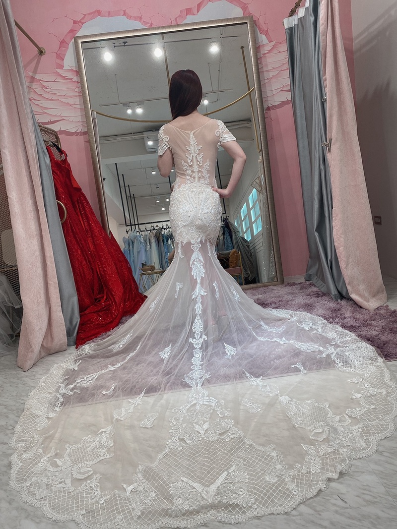 總監很有耐心的一一為我介紹所有的包套內容以及結婚拍照等等小細節,了解包套內容後,總監便帶著我們去婚紗區試穿,禮服秘書lala很專業貼心的以我的性感身形需求,幫我找了好幾件我好喜歡的婚紗讓我試穿,還很專業的幫我們介紹禮服的特色