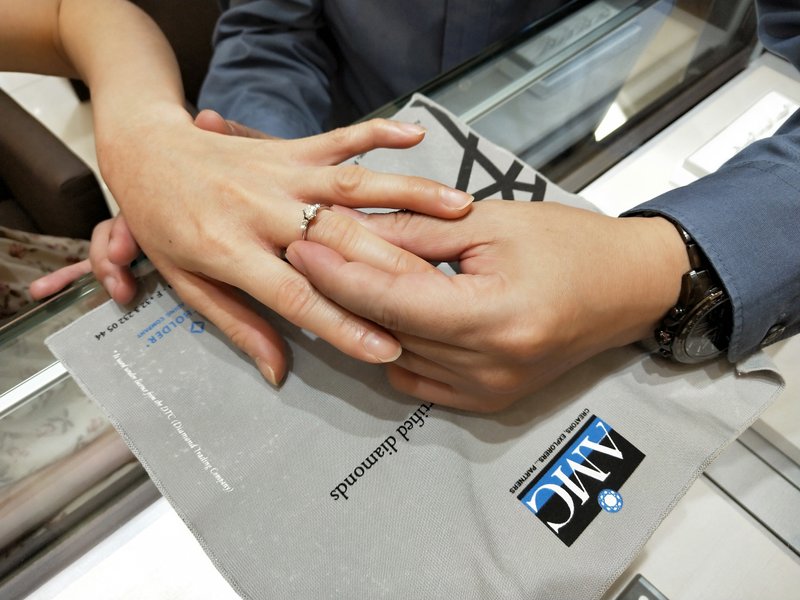 我一個男生單槍匹馬跑進AMC高雄店,它們很奇怪,一直推30分的給我...比較下來,價格真的很親民啊!!!但我要50分的,我要完成太太的期待,果然不負苦心人,在一顆顆等級的鑽石中,挑選了一顆純淨的就像我的心一樣,店員也很配合的不透露價格,再配合買戒台送鑽石的小謊,讓太太能盡興的挑選喜歡的戒台(戒台對比鑽石可是便宜很多),真的是天衣無縫啊,哈哈,好感謝AMC高雄店的配合演出,今天這一刻的圓滿,更突顯所有配合的人的努力,看到太太擠出幸福的眼淚,真的好開心!