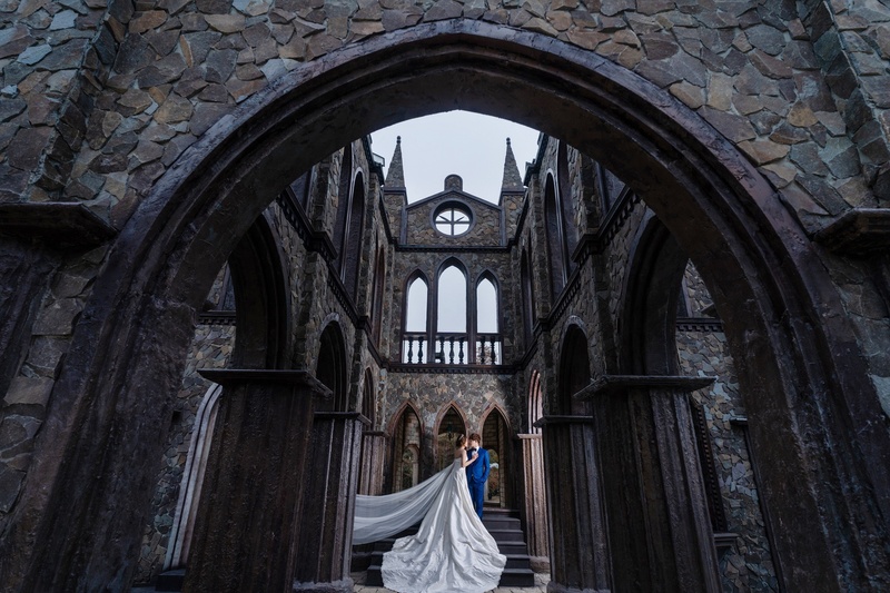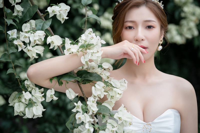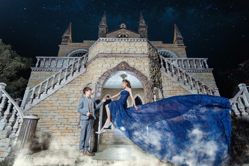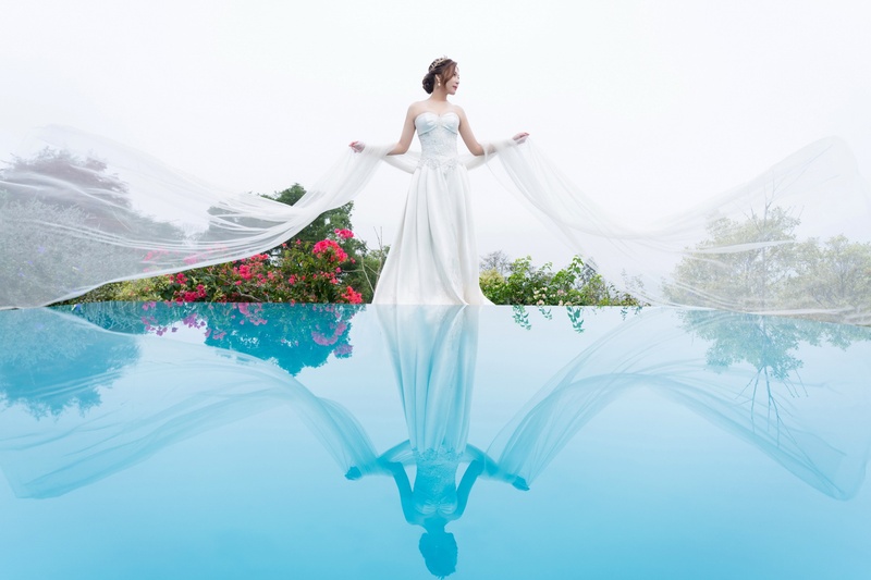跟攝影師配合的很好,過程中ㄧ直跑來跑去的,忙著整理裙擺、打光、扛著器具,很細心的注意各種狀況。