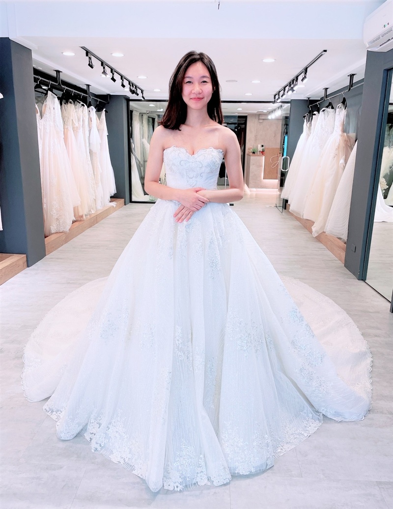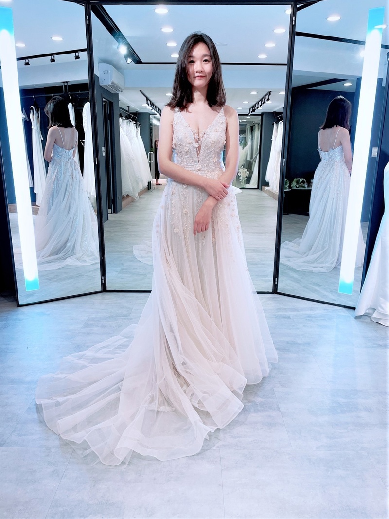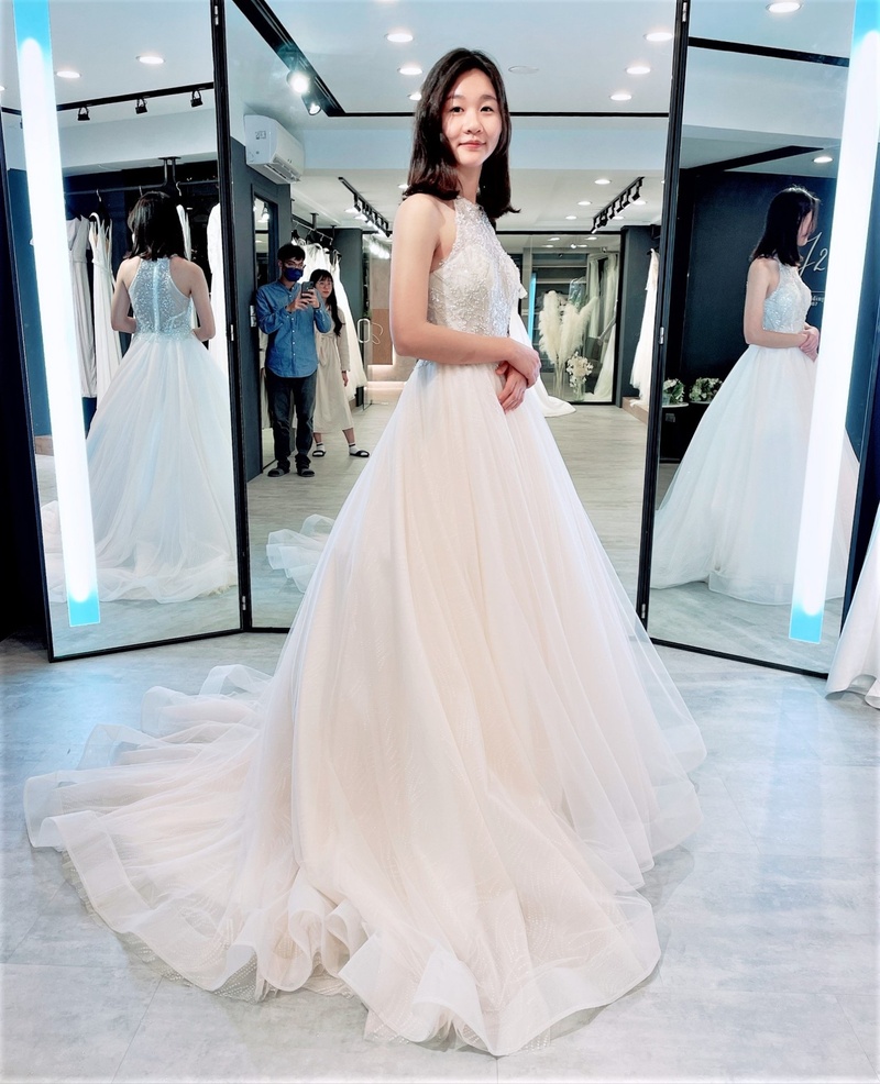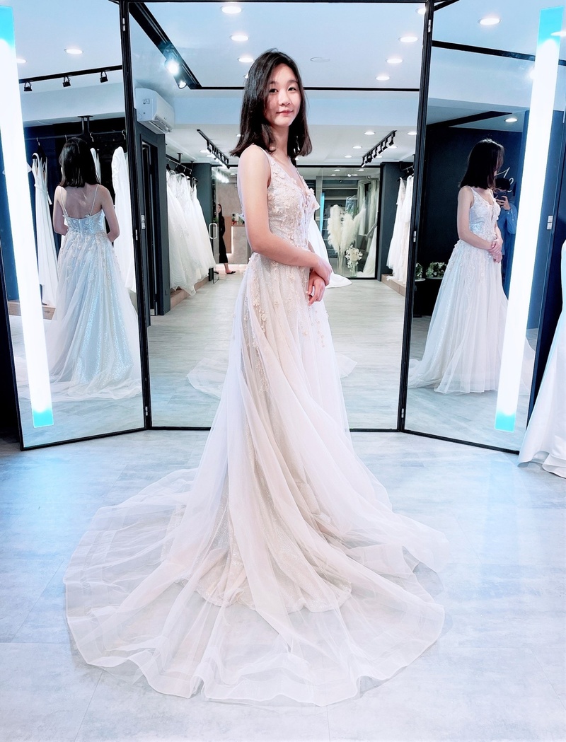 另外下方這件削肩款真的很厲害👍本人肩寬近40公分 但穿在身上完全沒有變成金剛芭比 上方的蕾絲與薄紗都超細緻 直接優雅+10點滿 另外這是加了襯裙的感覺 如果跟我一樣比較偏愛A line 的朋友 可以選擇不加哦