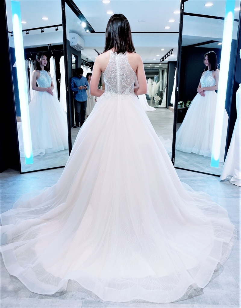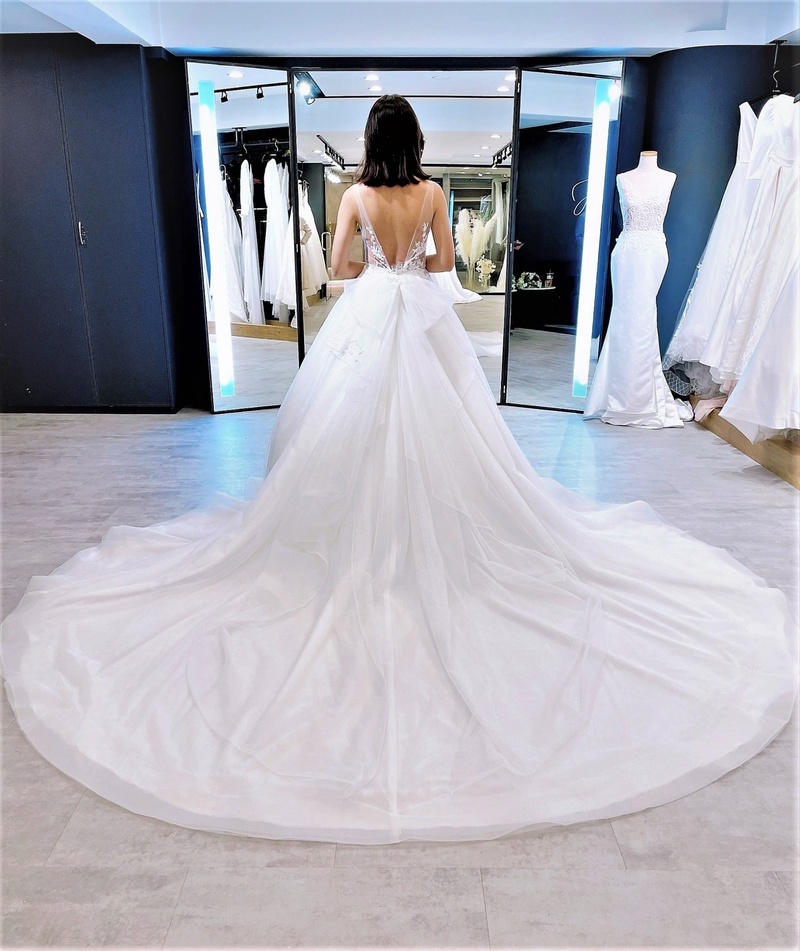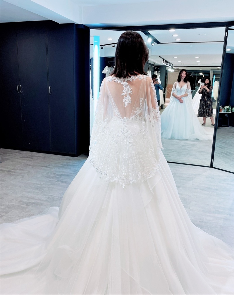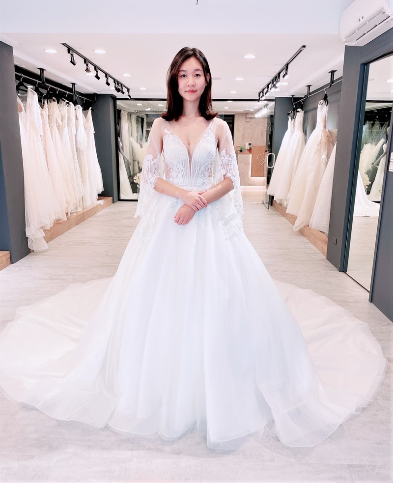 另外下方這件削肩款真的很厲害👍本人肩寬近40公分 但穿在身上完全沒有變成金剛芭比 上方的蕾絲與薄紗都超細緻 直接優雅+10點滿 另外這是加了襯裙的感覺 如果跟我一樣比較偏愛A line 的朋友 可以選擇不加哦