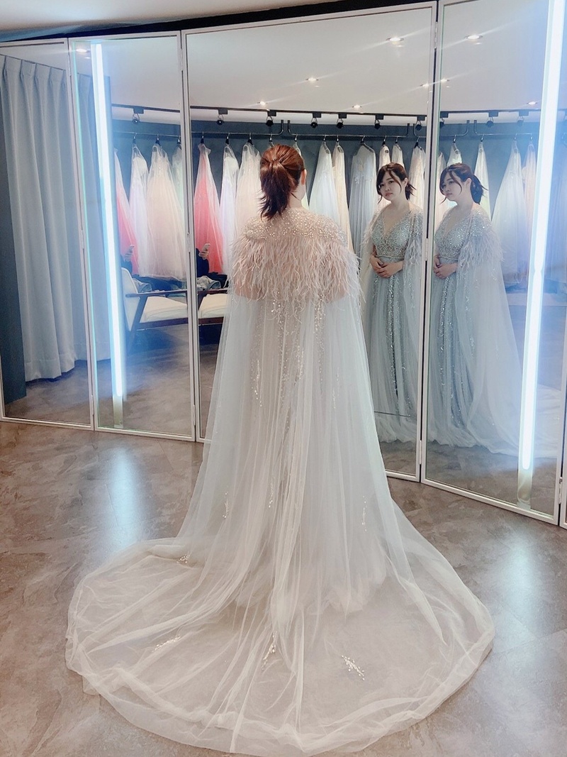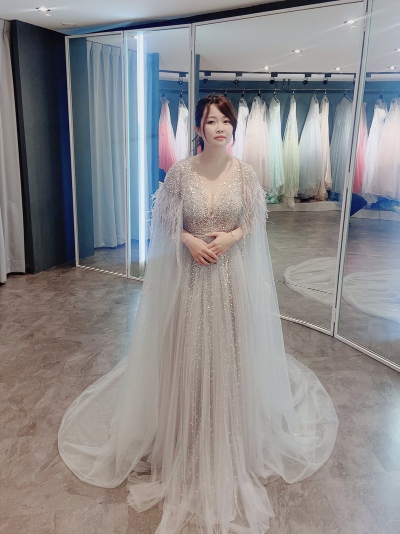 這件穿起來整個很閃很亮搭配披風整個氣勢感飆升~ 披風可搭可不搭,一件禮服有兩種風格 整個很棒 超適合想要展現高強氣勢婚禮的新娘!二進或送客穿都很適合耶!