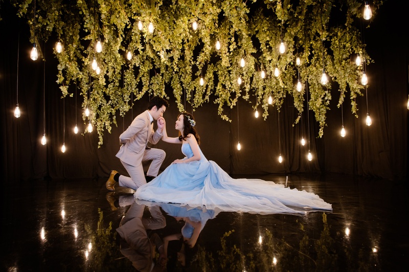 【西式】美美的藍色婚紗,在唯美的燈光下,婚紗上的亮紗也隨之閃耀。