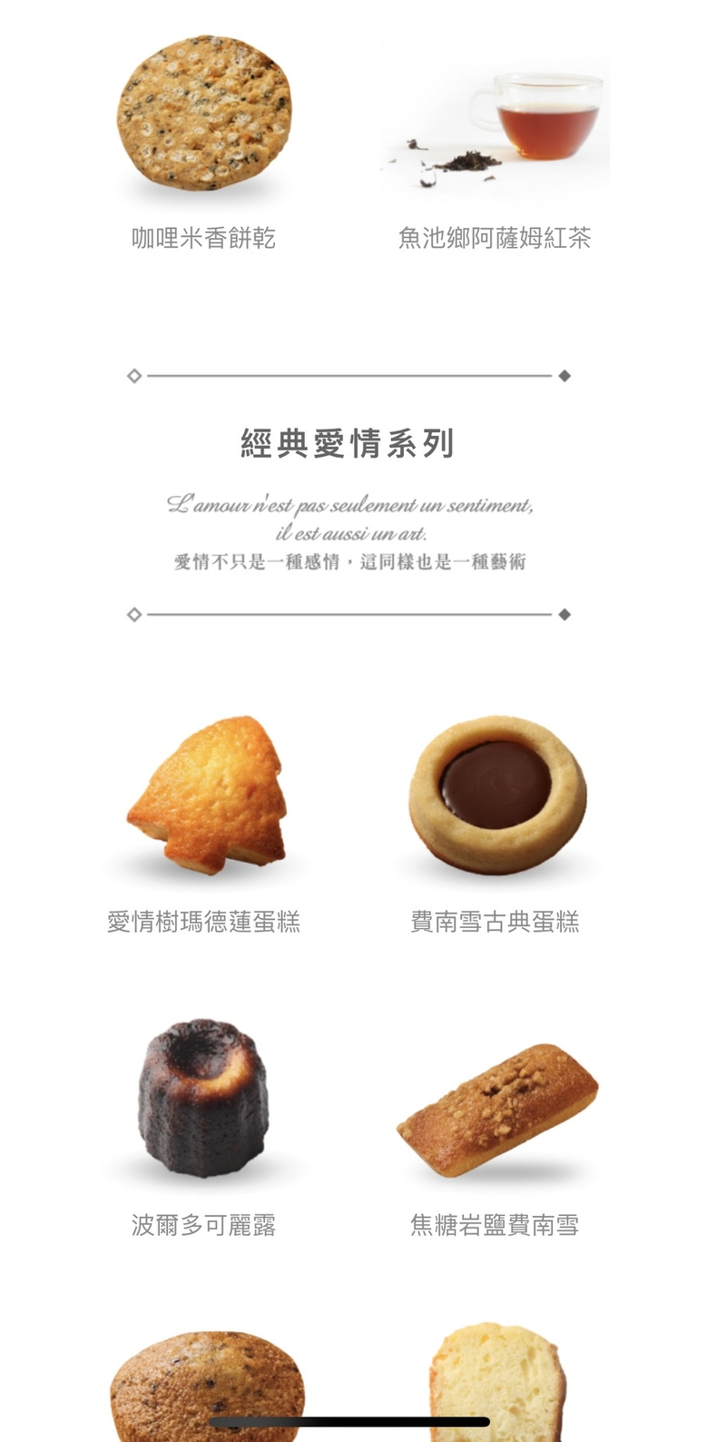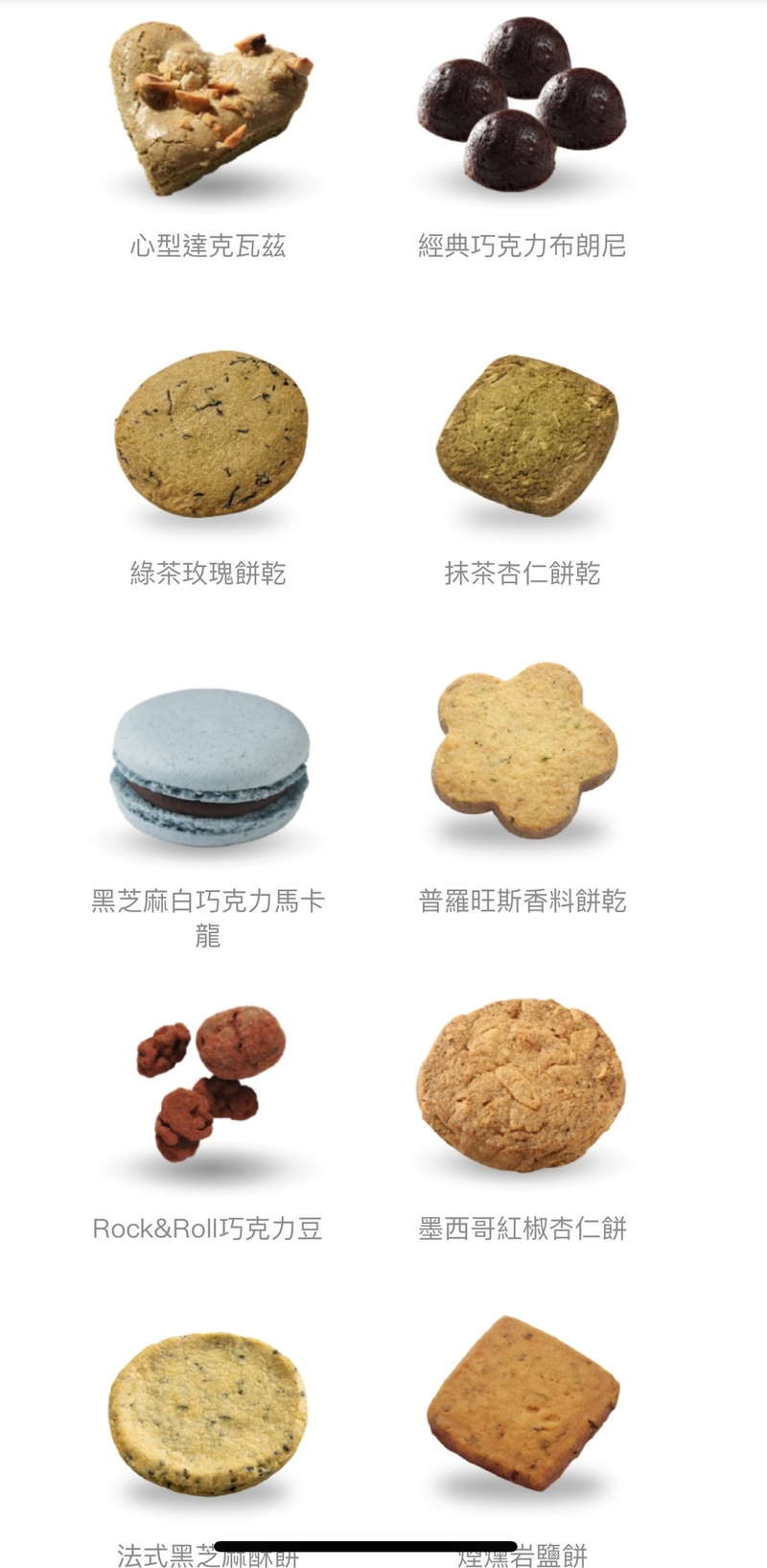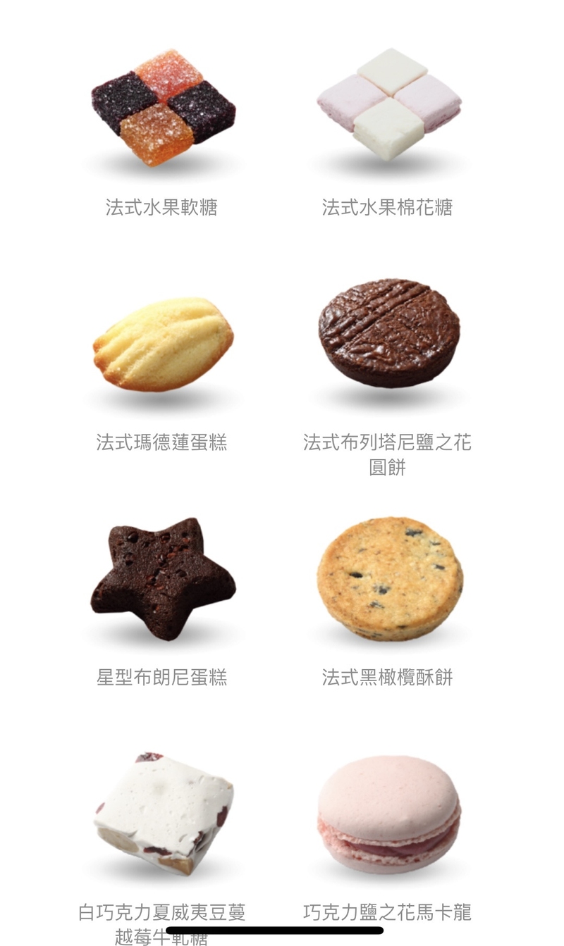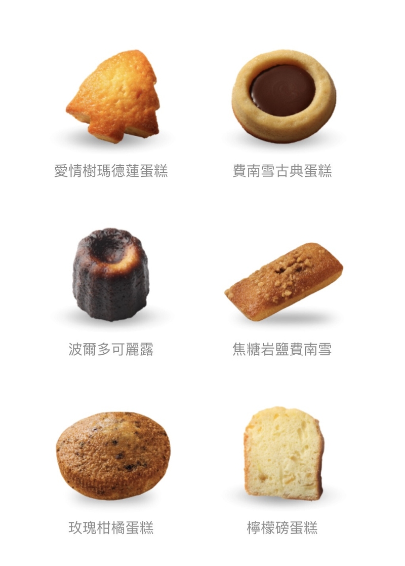 我選取了2種馬卡龍系列、法式布列塔尼鹽之花園餅、可愛的愛情樹瑪德蓮蛋糕、檸檬磅蛋糕、巧克力布朗尼、星型布朗尼蛋糕、古典費南雪、焦糖岩鹽費南雪⋯其實有好多都想選😛