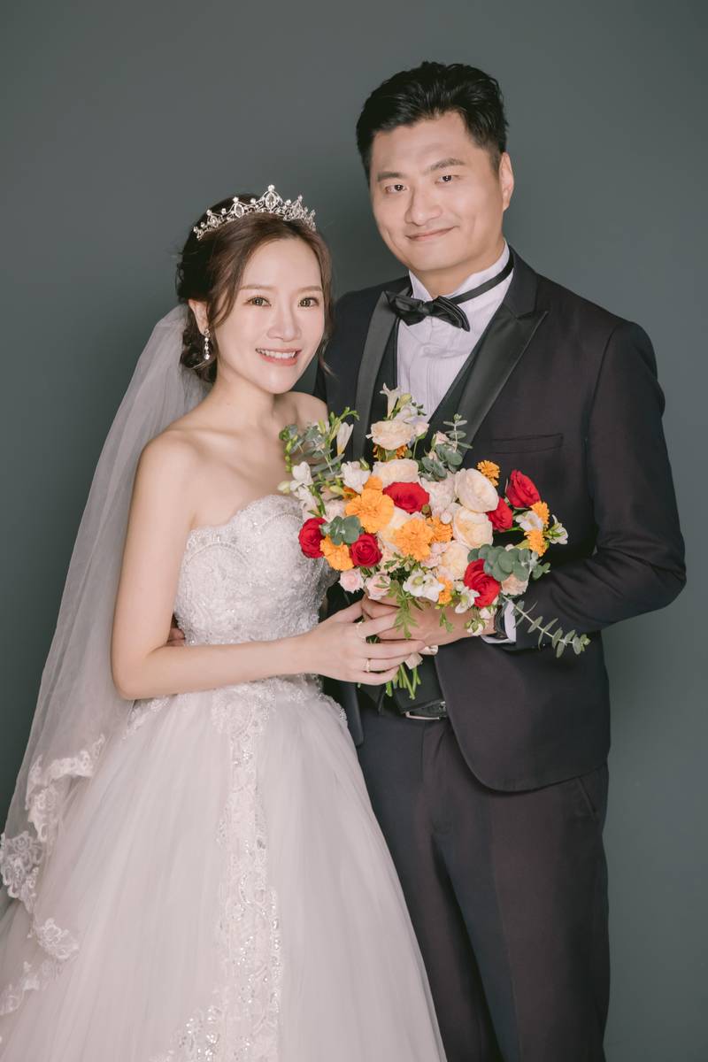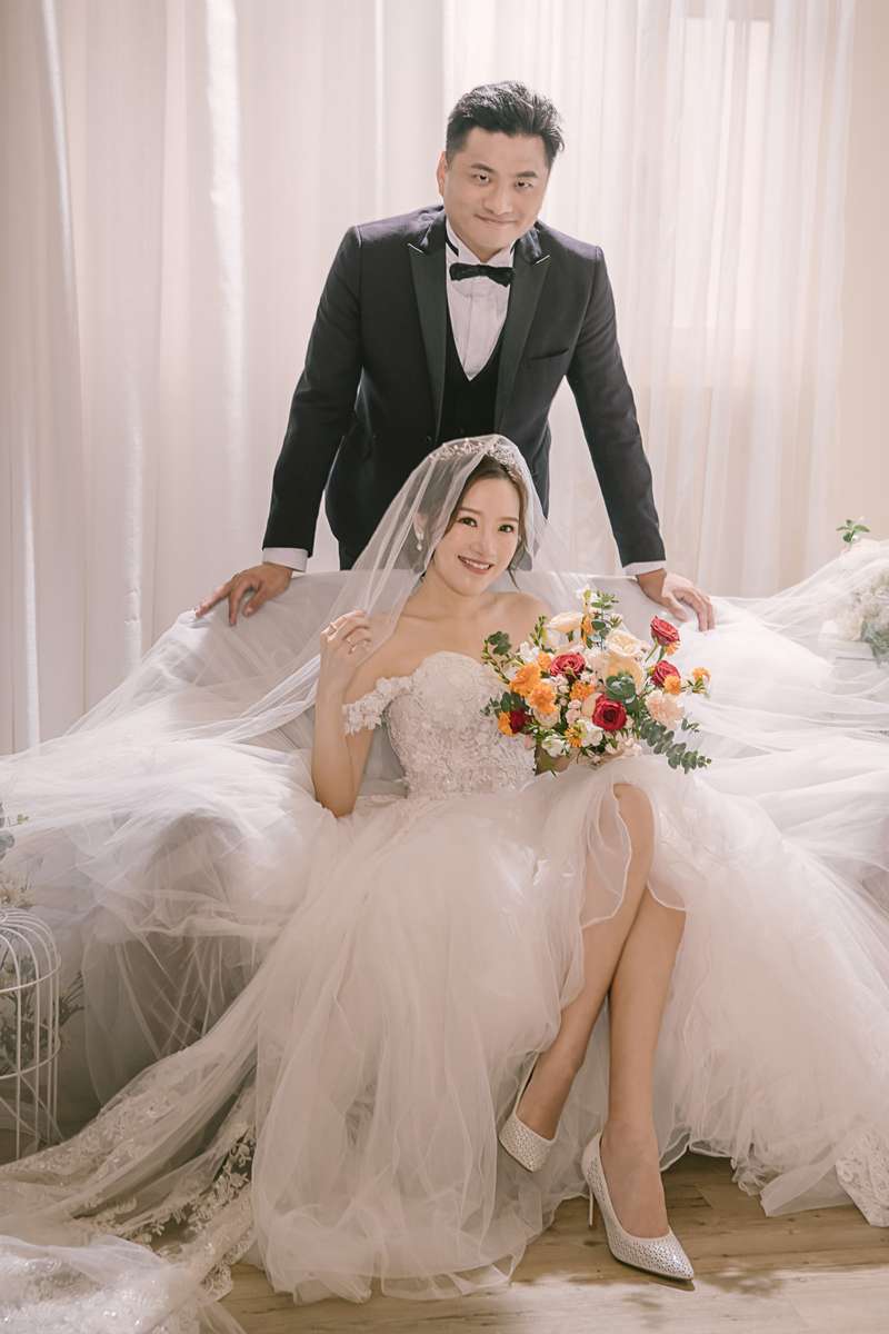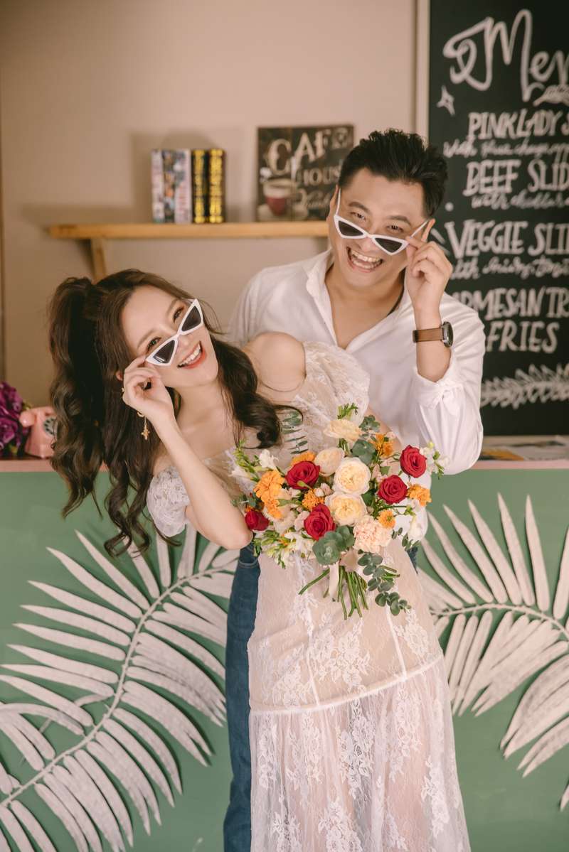 我們是9小時全棚內拍攝(伊頓的婚紗攝影棚),在拍攝前溝通小賀跟Angela都給予了很多建議,包含場景的搭配並融合了一些我的想法(當初想要有點韓系風格但又要有點活潑俏皮)。拍攝當天真的感受到小賀對於拍攝的熱情,幫我們設計很多不一樣的棚內場景,也會指導我們不同的動作與表情;搭配Angela幫我設計的完美造型,整個拍攝過程非常開心!是一個非常難忘的回憶!!