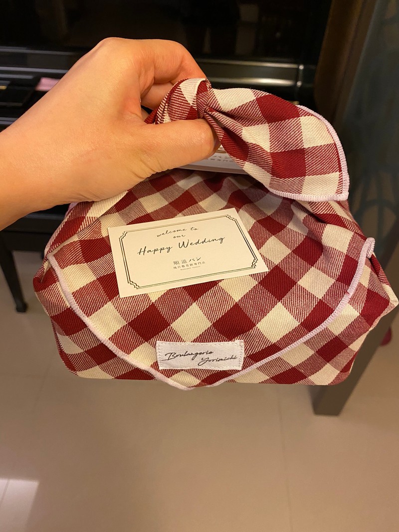 當初我吃到的他牌就是個有名的手工喜餅牌,覺得普普。後來,花了許多時間,我們看包裝一眼就選擇了順道パン。風呂敷喜餅専門店。