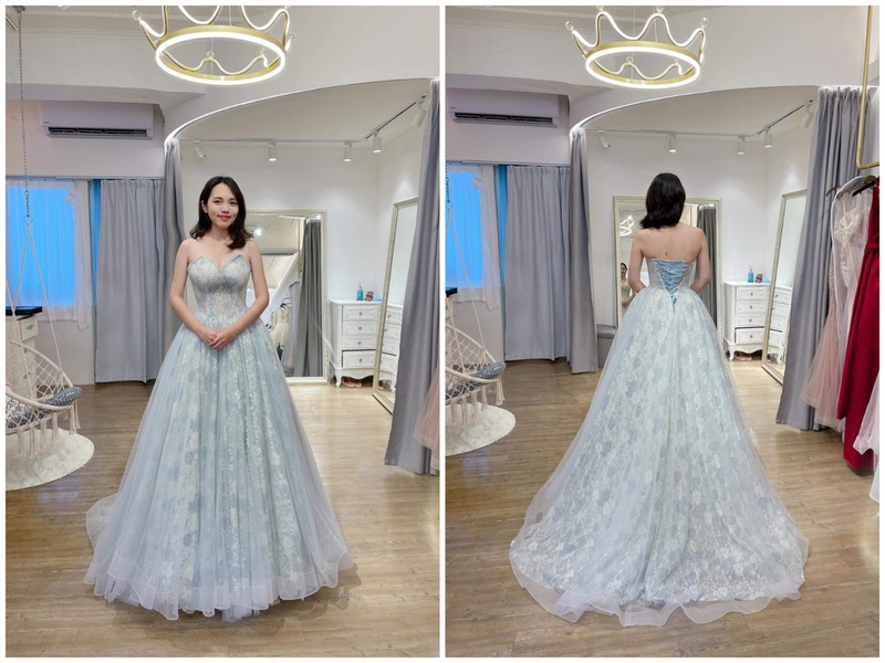 水藍色心形領長裙擺婚紗:上身胸形設計,立體顯酥胸,小露事業線的比例,能掩飾肩寬的視覺效果;腰封設計能修身,也能顯現下擺的垂感弧度。這類型的款式我也很愛,不必追求看不出來的名牌,就有高品質的享受!