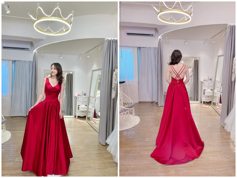 紅色的深V美背緞面材質的婚紗,非常襯托膚色,小拖尾也相當輕盈好走,很適合敬酒的時候穿,顯眼到全場焦點都會在自己身上的那種!經典款當中,建議挑幾件是不同顏色或跳色的,讓自己在每個回合都能變化風格!