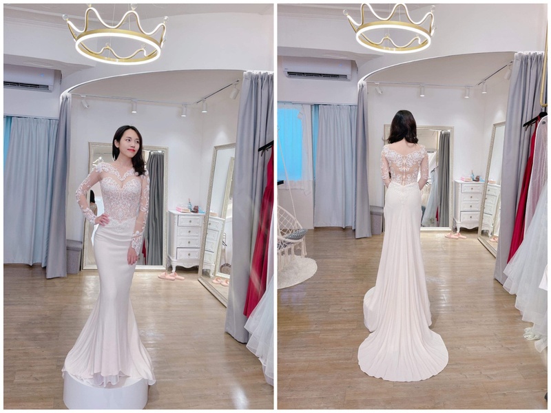 長袖蕾絲透膚魚尾緞面婚紗:貼身緊身顯身材,上身還有低胸的設計,擺個三七步的姿勢就很性感了,就像苗條的美人魚,這款絕對是老公最愛 >///< 但近看自己覺得手臂有點肉,魚尾婚紗還是需要減肥一下比較好駕馭~哈如果有跳舞表演橋段的婚禮,可以選短尾的輕薄有彈性面料,能活動自如。