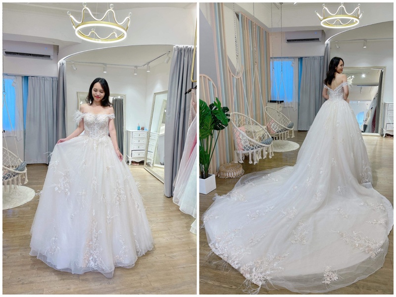 卡肩一字領長尾白紗禮服:適合像我手臂比較肉的女生穿,可以凸顯肩骨的線條,如果上胸再有肉一點會更完美!背部的大V型設計,展露誘人魅力!羽毛及蕾絲的點綴,讓整件婚紗更加亮眼!經典款的白紗能這樣設計,真的很有創意及美感,囍聚手工婚紗工作室的專業度,可以媲美知名品牌婚紗店!突出的脖頸鎖骨曲線、優雅的蓬裙長尾顯高挑,適合小花童進場時穿◕‿◕