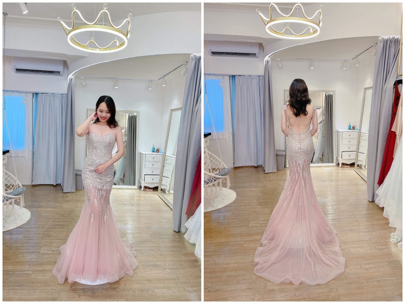 桃心領亮片雪紡魚尾婚紗:高貴氣質又性感,比起上一件我更愛這款的設計,華麗又不失典雅,若隱若現的裙擺+U型裸背,非常吸睛迷人,給滿分!
