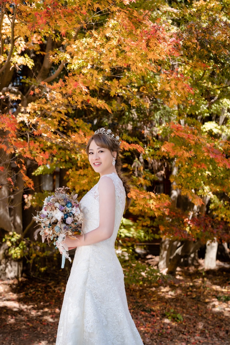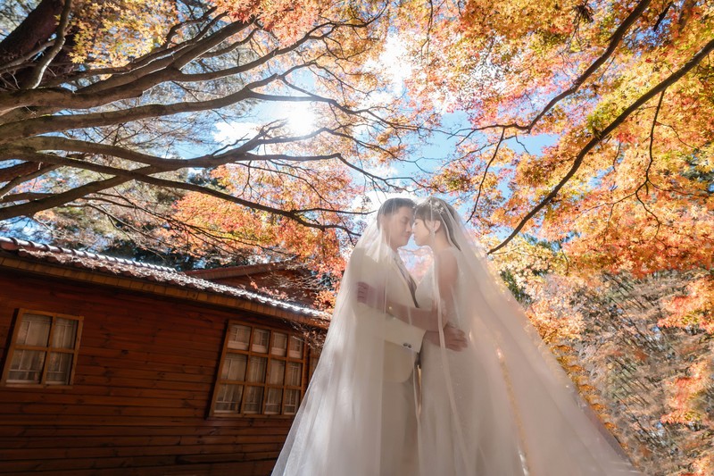 與老婆在彼此討論後,針對旅遊時楓葉最讓人有印象,一起從發達的網路中挑選幾間拍起來覺得特別順眼的婚紗廠家
