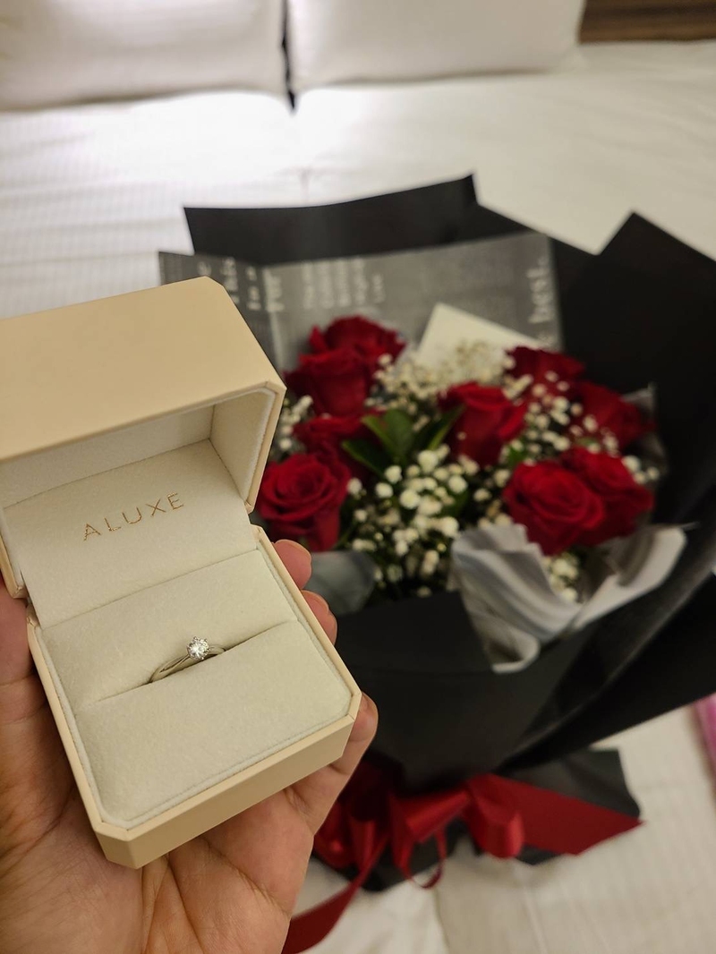 12/18 是和朋友們的交換禮物活動,想不到另一半藉此使用這方式像我求婚,當我抽到禮物打開看到ALUXE亞立詩,真的只有驚嚇而已,當看到鑽戒那刻也覺得太美了。當下當然點頭答應了。